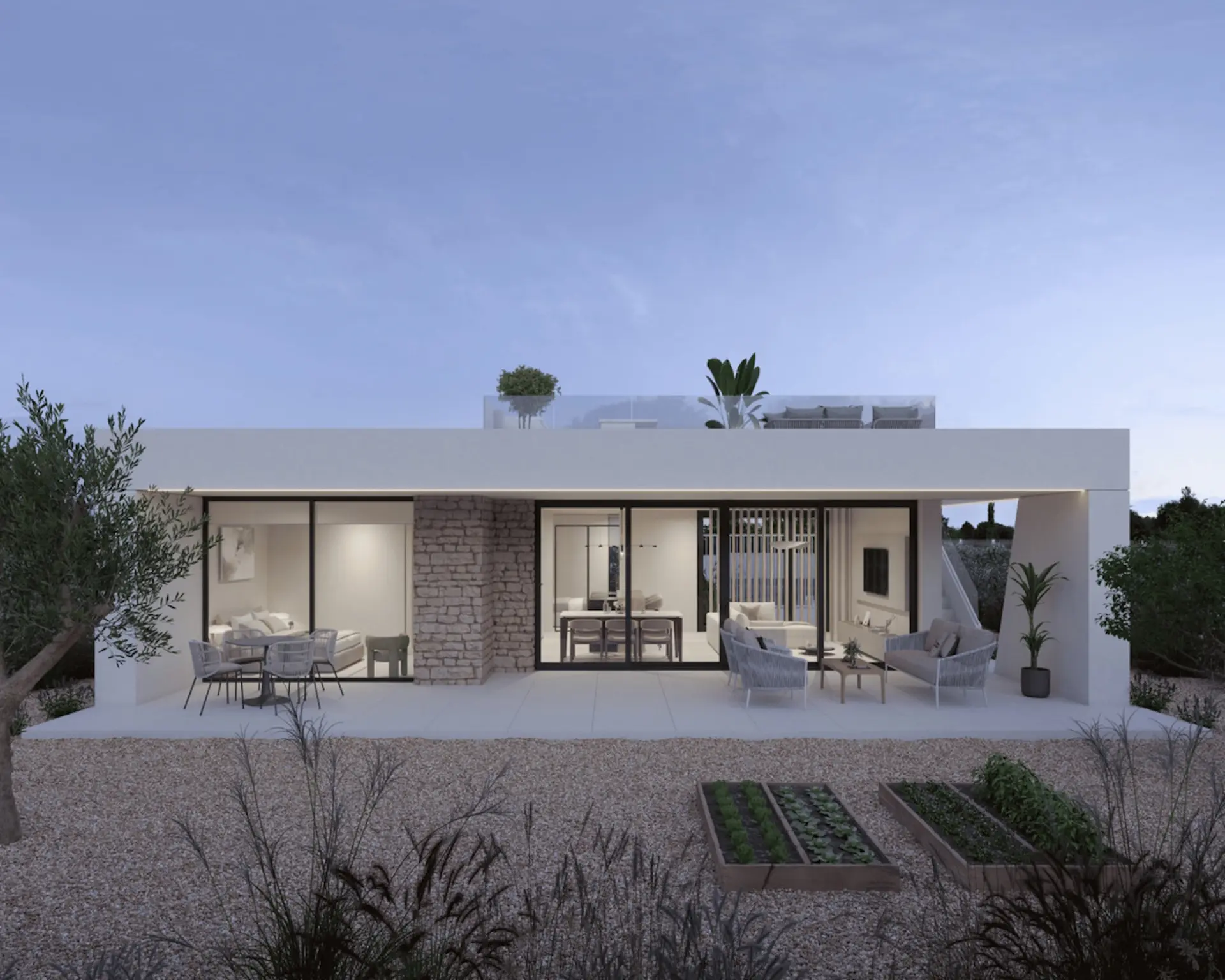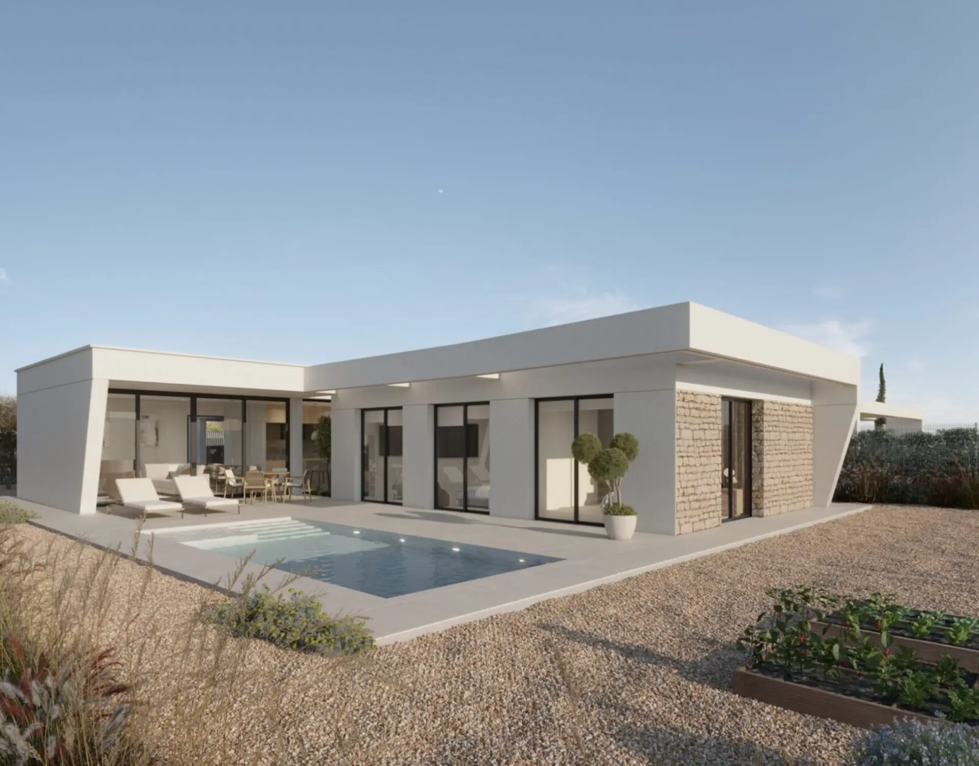 Die Villen befinden sich auf privaten Grundstücken von 400 m2 und sind für das Leben im Freien konzipiert. Viele Villen haben einen privaten Pool und alle Bewohner haben Zugang zu einem großen Gemeinschaftspool mit Grünflächen und einem Kinderspielplatz. Einige Häuser haben eine Garage, andere haben Privatparkplätze.