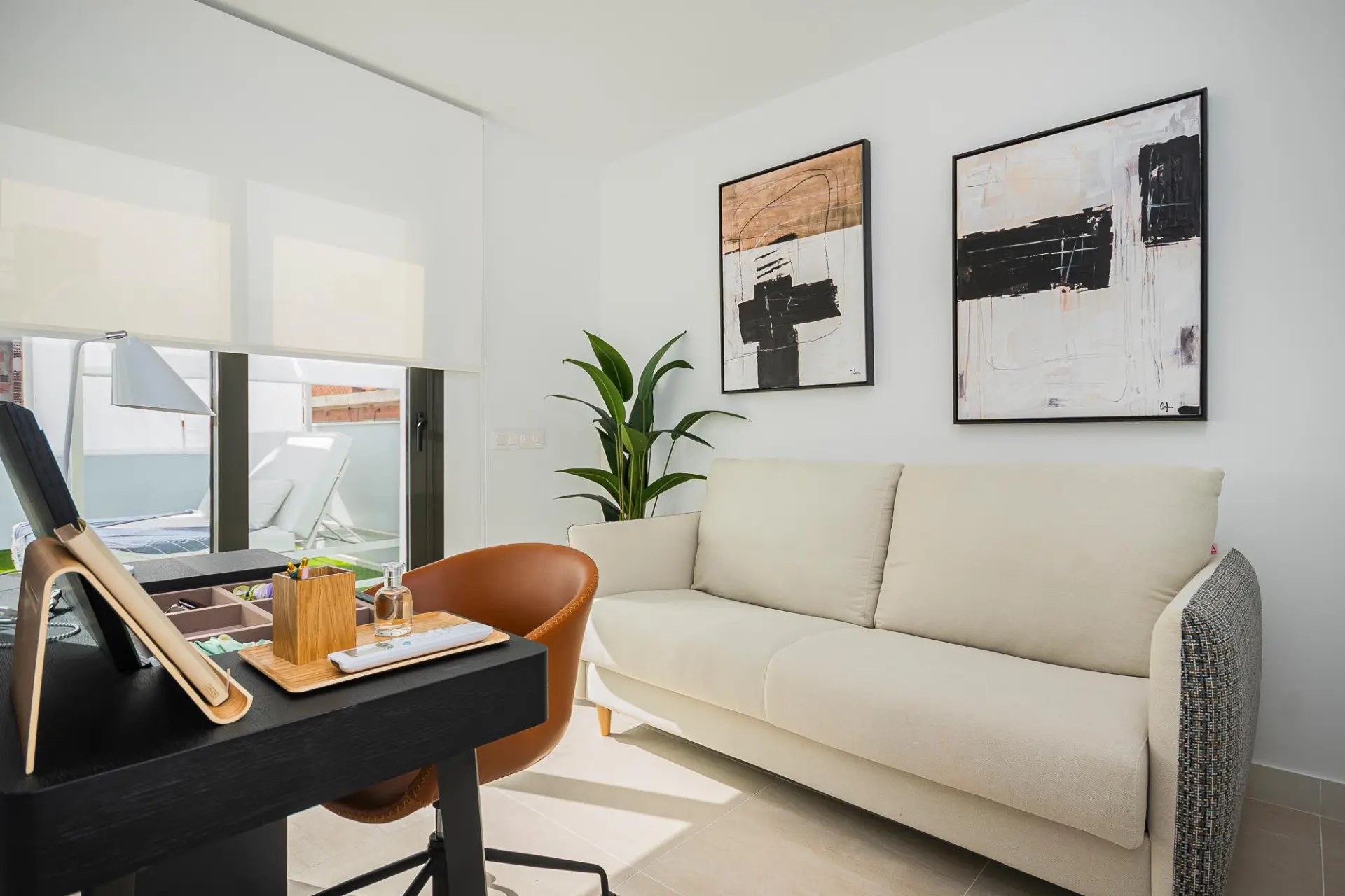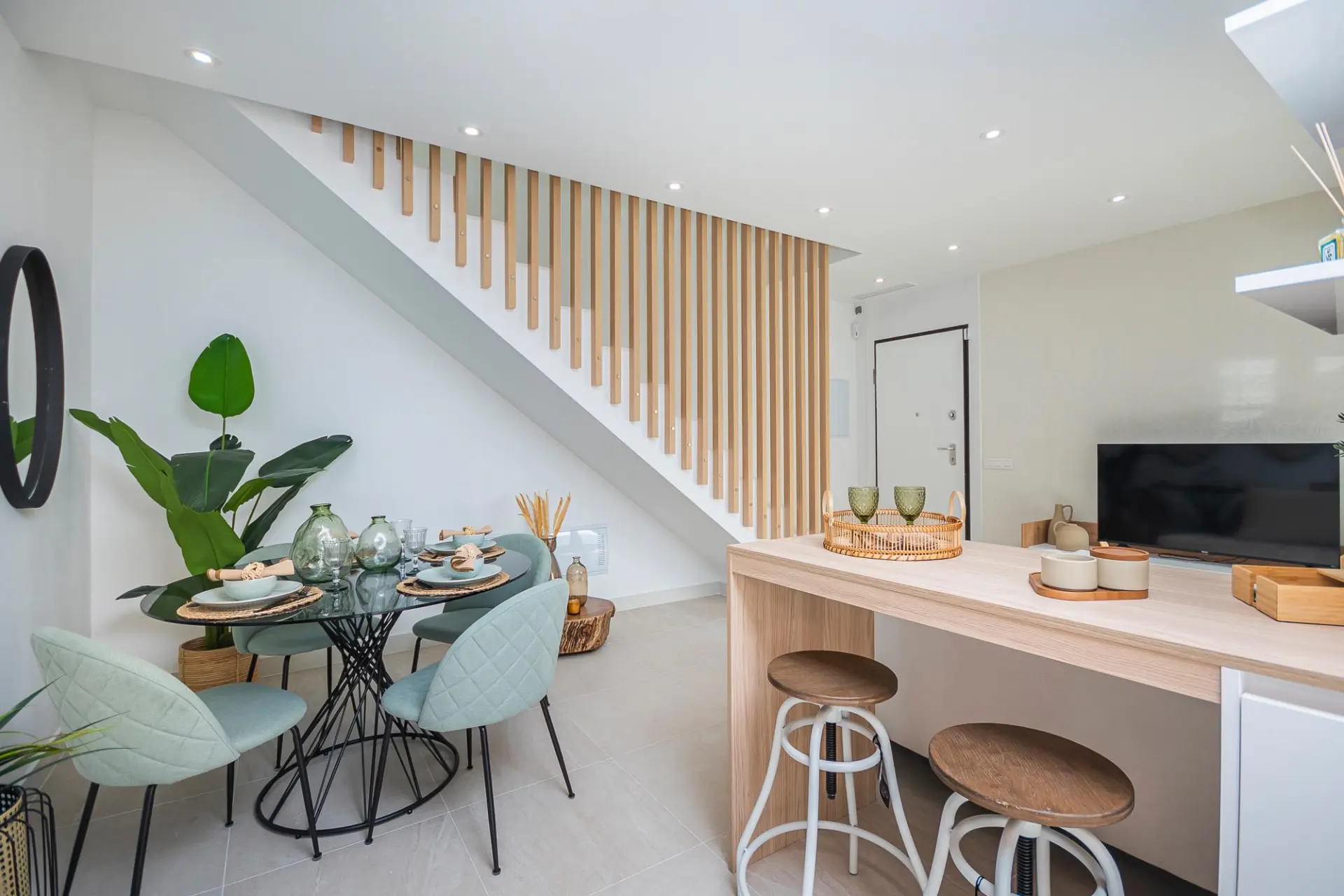 Die Villa verfügt über ein helles Wohnzimmer mit offener Küche und Essbereich, die direkt an die Terrasse und den privaten Pool von 10 m² anschließen. Große Schiebetüren sorgen für viel Tageslicht und eine nahtlose Verbindung zum Garten.