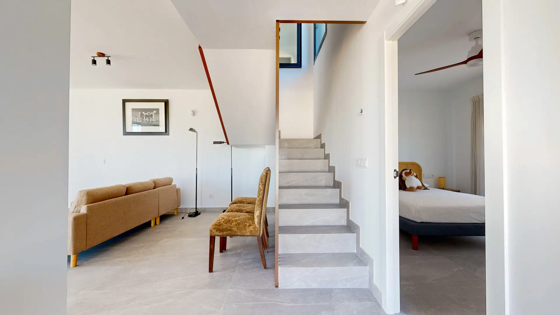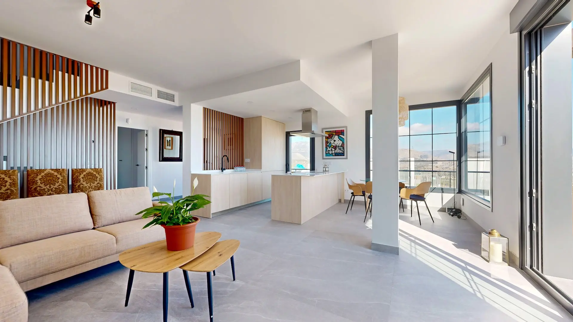 Das Erdgeschoss der Villen bietet eine offene Küche, die mit einem großzügigen Wohnzimmer verbunden ist, sowie ein Gästezimmer mit eigenem Bad und Einbauschrank. Eine 38 Quadratmeter große Terrasse, die vom Wohnzimmer aus zugänglich ist, bietet den perfekten Ort, um abendliche Sonnenuntergänge zu genießen.