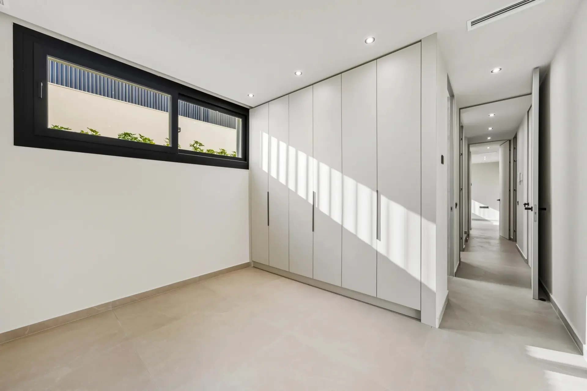 Die Villa erstreckt sich über ein Erdgeschoss, ein Untergeschoss und ein großzügiges Solarium und bietet insgesamt 4 Schlafzimmer und 4 Badezimmer. Im Erdgeschoss befinden sich 2 Schlafzimmer mit en-suite Badezimmern, darunter eine Master-Suite mit bodentiefen Fenstern zu einem Juliette-Balkon und einer Terrasse. Das offene Wohn- und Esszimmer mit großen Fensterfronten geht nahtlos in die überdachte Terrasse über und schafft einen hellen Wohnraum, in dem Innen- und Außenbereich harmonisch miteinander verschmelzen. Im Untergeschoss befinden sich zwei weitere Schlafzimmer mit eigenem Bad, ein multifunktionaler Raum, der sich als Spielzimmer oder Heimkino eignet, ein voll ausgestatteter Hauswirtschaftsraum sowie zusätzliche Abstellräume – ideal für Familien oder Gäste.