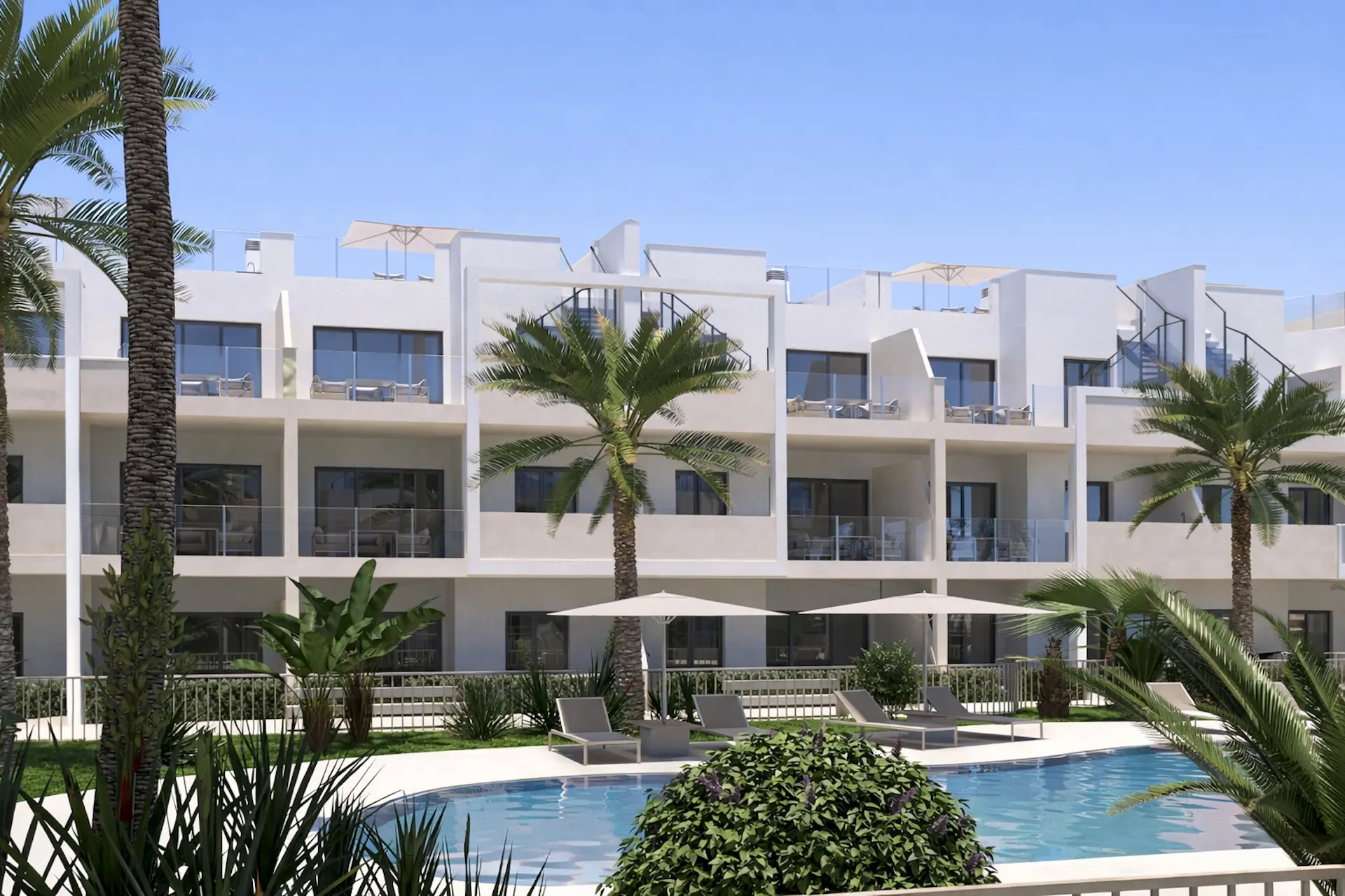 Jede Residenz verfügt über einen privaten Außenbereich, der das mediterrane Leben in den Mittelpunkt stellt. Die Wohnungen im Erdgeschoss haben einen eigenen Garten, im ersten Stock eine geräumige Terrasse und die oberen Stockwerke bieten neben einer Terrasse auch ein privates Solarium. Auf der Terrasse oder dem Solarium befindet sich eine Sommerküche, die sich perfekt für lange Abendessen im Freien eignet. Die Gemeinschaftsbereiche sind wunderschön angelegt mit 2 Swimmingpools, grünen Gärten und einem Fitnessraum, wo Entspannung, Bewegung und geselliges Beisammensein zusammenkommen.