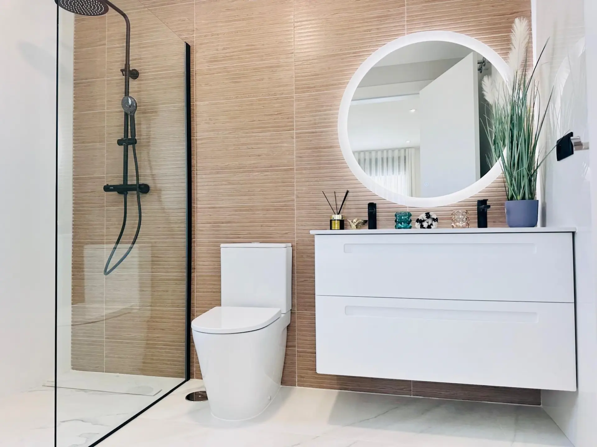 Zusätzliche Ausstattungsmerkmale wie motorisierte Rollläden, eine gesicherte Eingangstür und Bäder mit beleuchteten Spiegeln sorgen für zusätzlichen Luxus. Ein komplett möbliertes Musterhaus steht zur Besichtigung bereit.