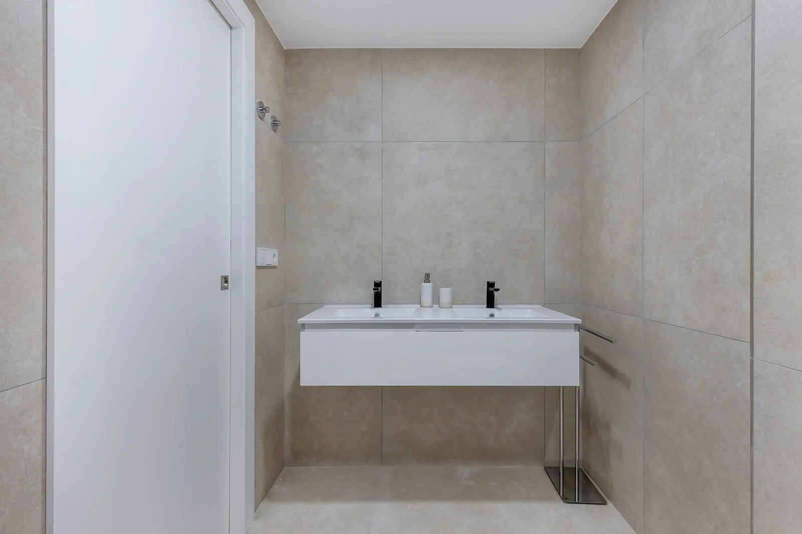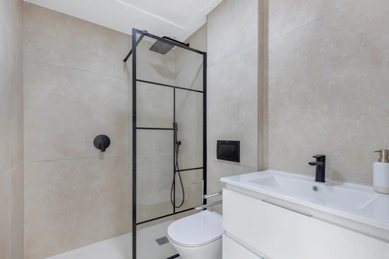 Die Wohnungen sind mit einem offenen Grundriss gestaltet, bei dem Wohnbereich, Esszimmer und Küche nahtlos ineinander übergehen. Sie können zwischen 2 oder 3 Schlafzimmern und 2 Bädern wählen, die mit hochwertigen Materialien und modernen Details ausgestattet sind. Große Glasschiebetüren lassen viel Tageslicht herein und bieten direkten Zugang zur Terrasse. Die Küche ist mit integrierten Geräten ausgestattet, während eine Klimaanlage mit Kanalsystem und Einbauschränke für ein sorgenfreies, zeitgemäßes Wohnerlebnis sorgen.