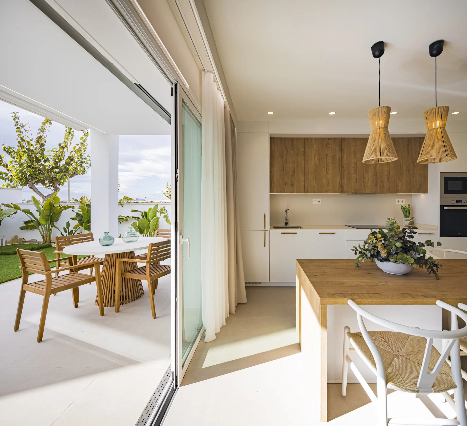 Die Obergeschosswohnungen bieten ebenfalls 2 oder 3 Schlafzimmer und 2 Badezimmer, dazu einen offenen Wohnbereich und eine großzügige Dachterrasse mit Außenküche. Dies ist der ideale Ort für sonnige Tage, Abendessen unter den Sternen oder einfach, um den mediterranen Ausblick zu genießen.