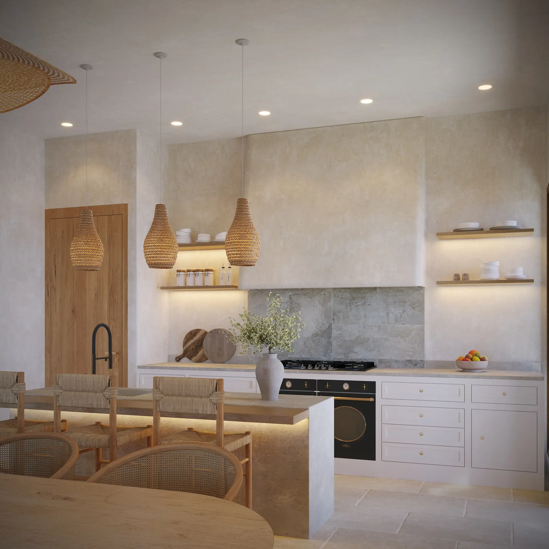 Die Villa verfügt über einen großzügigen offenen Wohnbereich mit Essbereich und einer voll ausgestatteten Küche mit direktem Zugang zum beeindruckenden Infinity-Pool und den sonnigen, nach Westen ausgerichteten Terrassen. Angrenzend befinden sich ein praktischer Waschraum und eine Gästetoilette. Im Schlafbereich befinden sich vier geräumige Doppelzimmer, jedes mit einem eigenen Bad. Das Hauptschlafzimmer verfügt außerdem über einen luxuriösen begehbaren Kleiderschrank. Alle Schlafzimmer sind mit elektrischen Außenrollläden ausgestattet, während die Badezimmer mit stilvollen schwarzen Armaturen für einen modernen Akzent versehen sind.