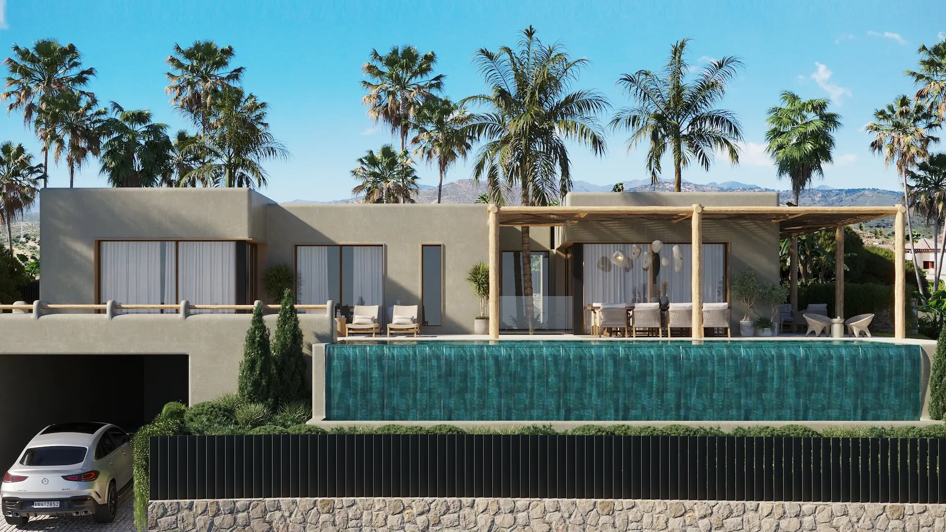 Der spektakuläre 42 m² große Infinity-Pool mit flachem „Strandbereich” bildet den Mittelpunkt der Außenanlagen – ideal zum Entspannen, Sonnenbaden und Genießen des mediterranen Klimas. Die Villa ist von insgesamt 200 m² Terrassen umgeben, darunter eine wunderschöne überdachte Terrasse unter einer stilvollen Pergola, die sich perfekt für stimmungsvolle Abendessen das ganze Jahr über eignet.