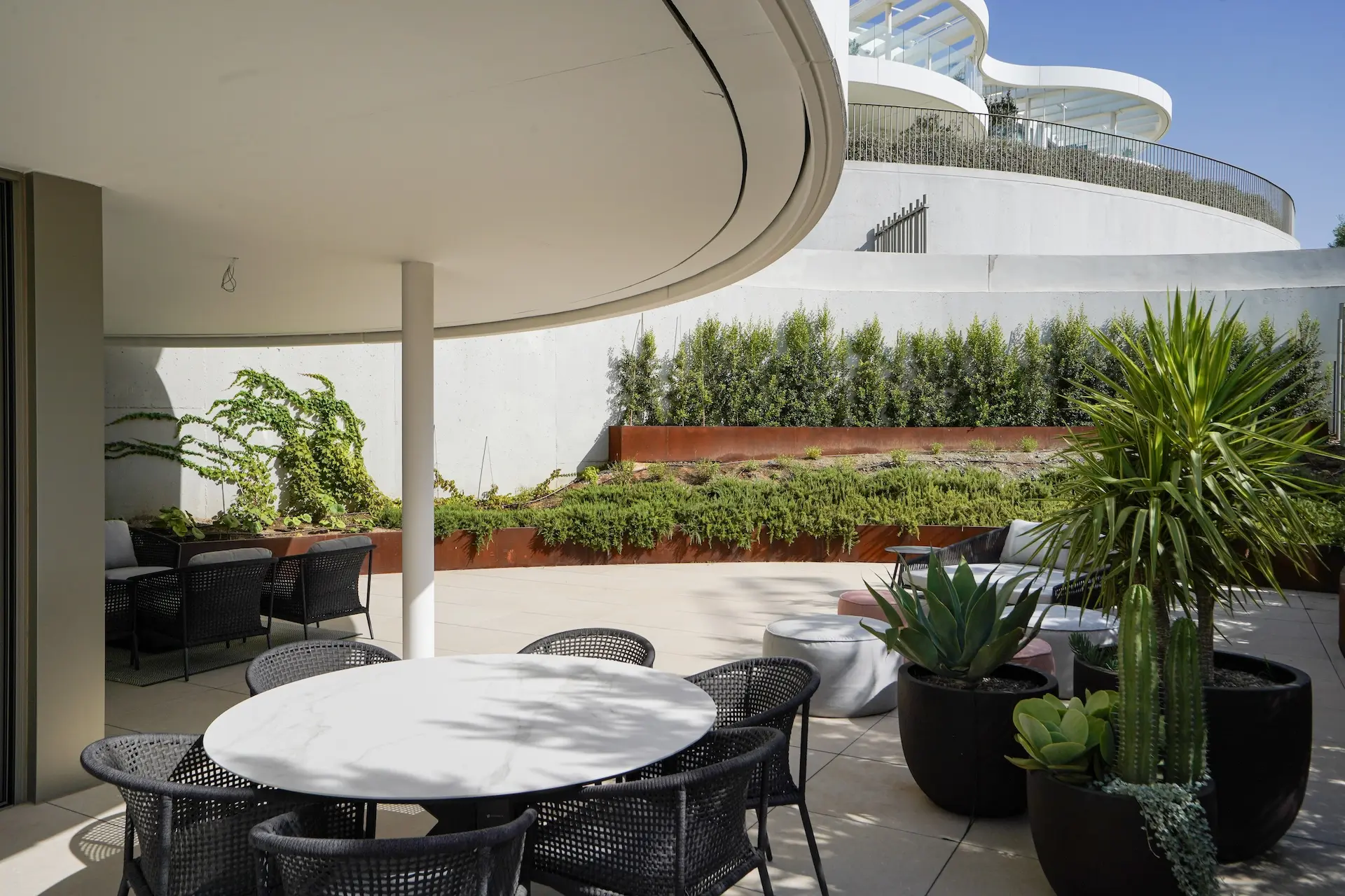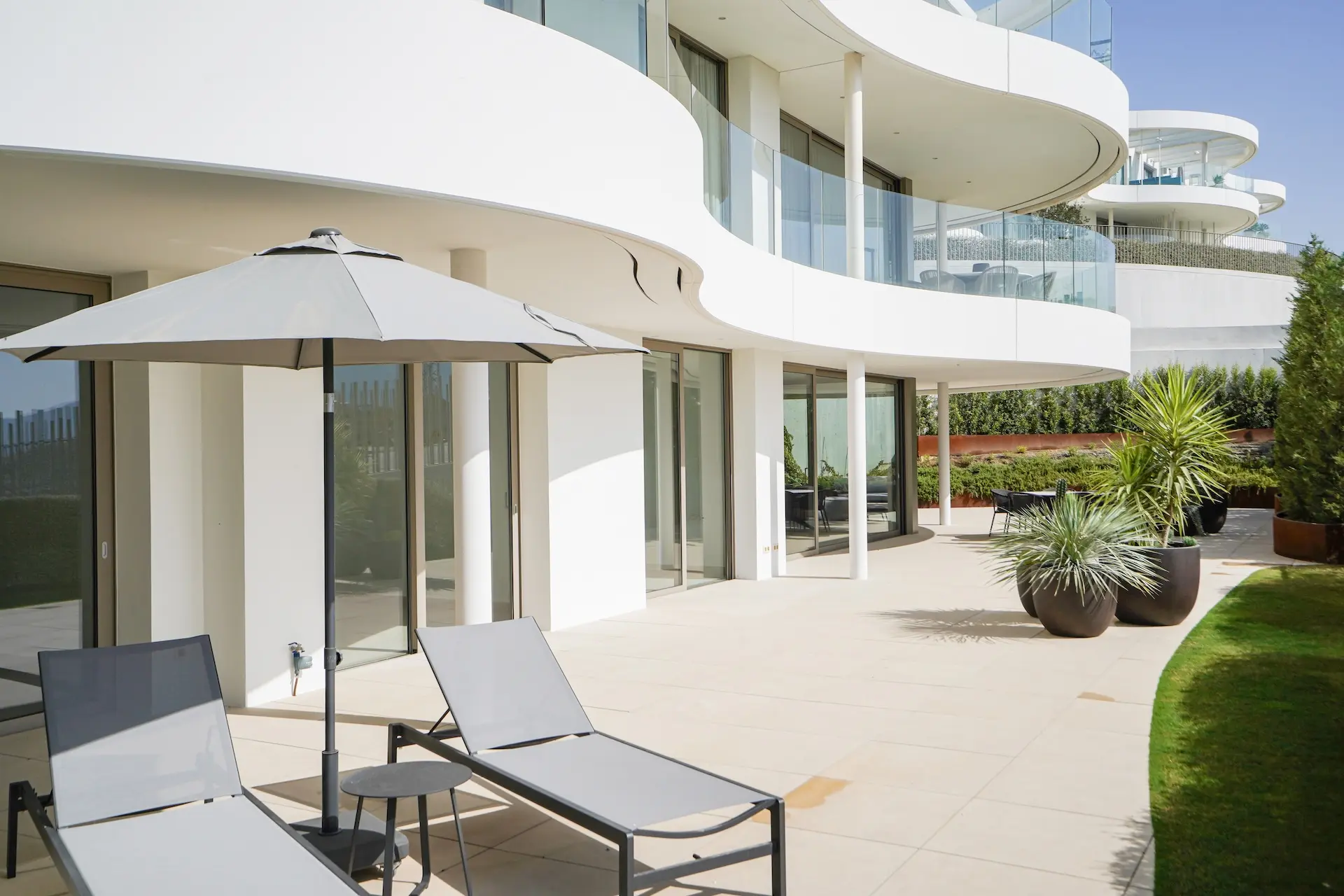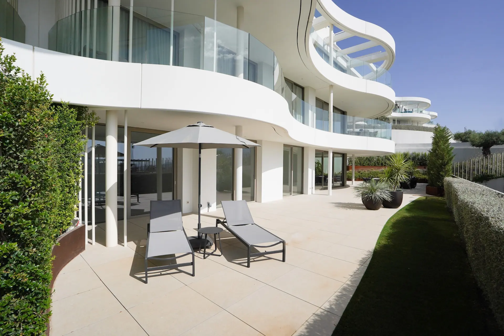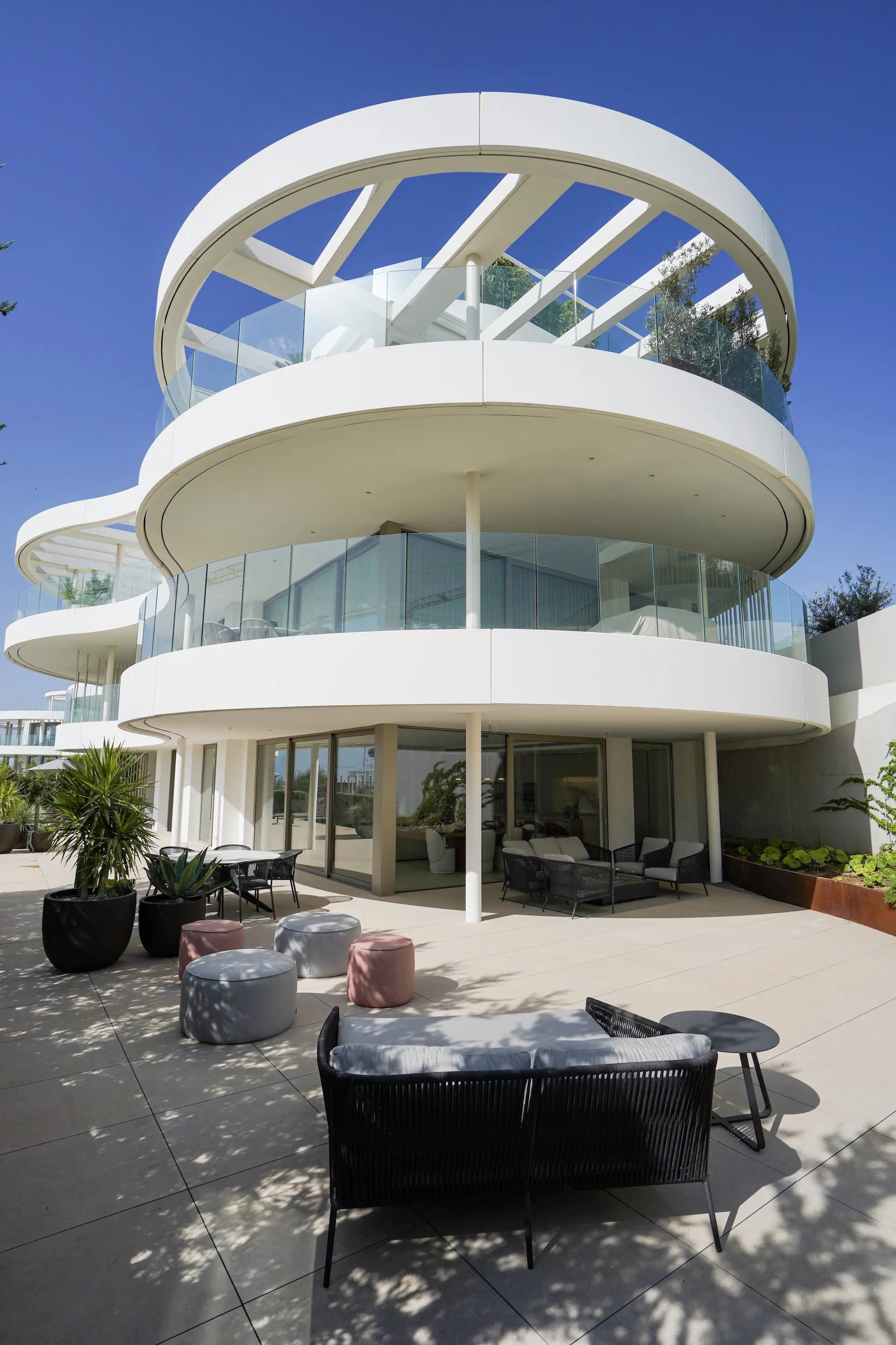 Le projet propose plusieurs types de logements : appartements en rez-de-chaussée avec jardin privé, étages intermédiaires avec grandes terrasses et penthouses offrant une vue panoramique spectaculaire sur la Méditerranée. Chaque appartement est conçu pour maximiser la lumière naturelle et offrir une transition fluide entre intérieur et extérieur.