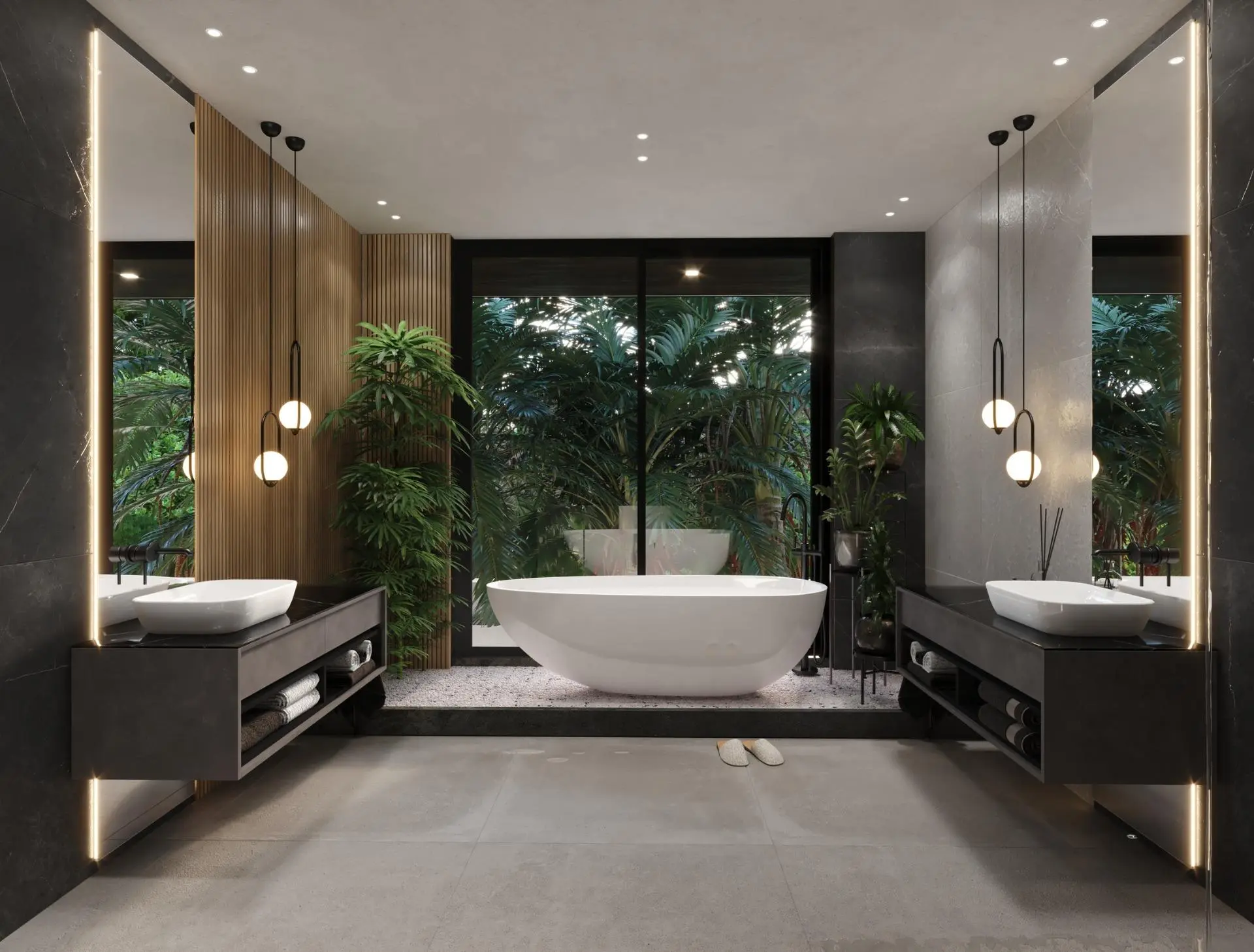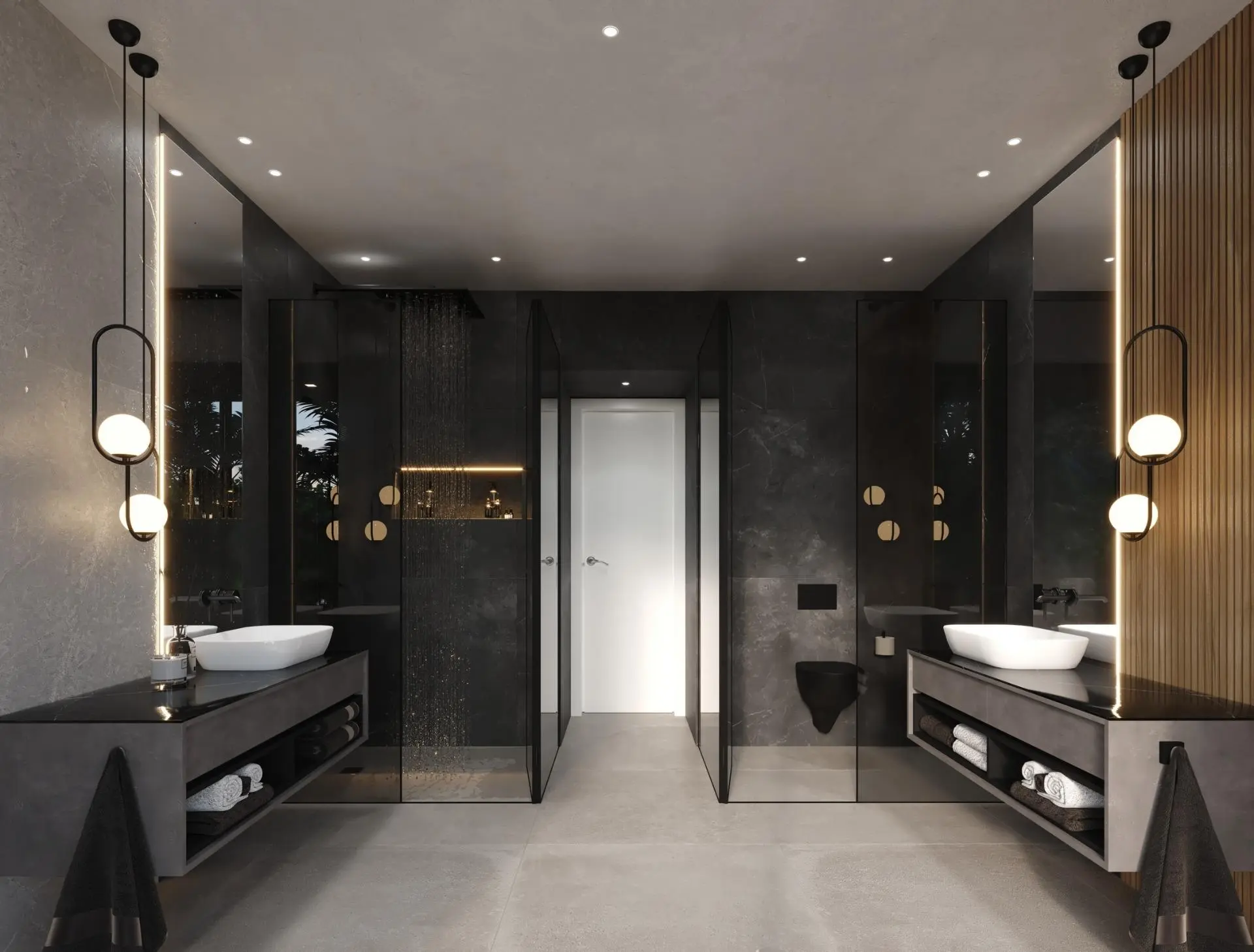 Le rez-de-chaussée comprend une cuisine ouverte spacieuse et un espace de vie qui s’ouvre sur de vastes terrasses et un espace de détente au bord de la piscine.
