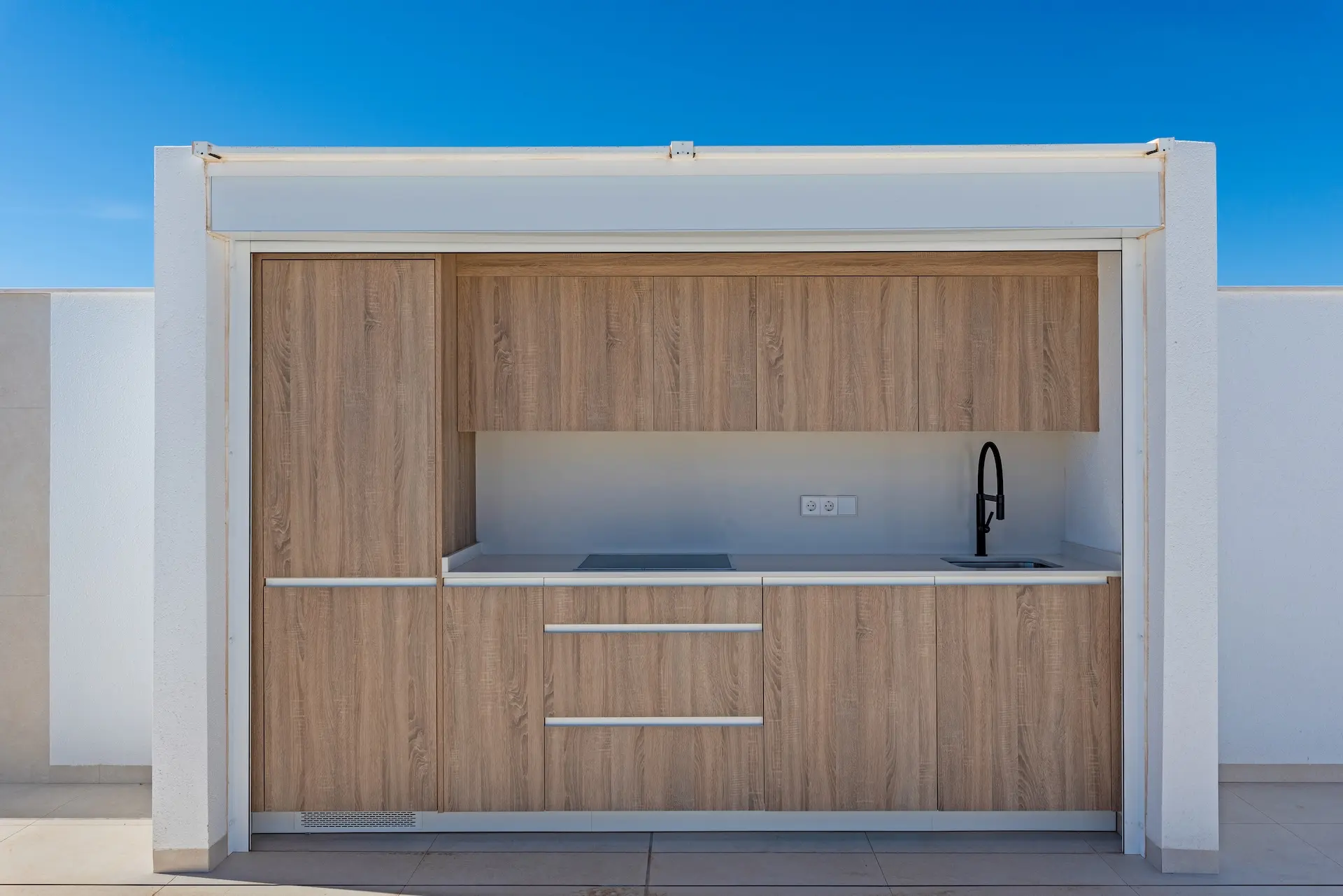 Les appartements du rez-de-chaussée bénéficient d’un jardin privé à l’avant et à l’arrière, idéal pour se détendre au soleil. Les étages supérieurs offrent un vaste solarium privé avec cuisine d’été, pergola, gazon synthétique et éclairage LED — parfait pour des dîners au coucher du soleil ou pour profiter du style de vie méditerranéen en plein air.