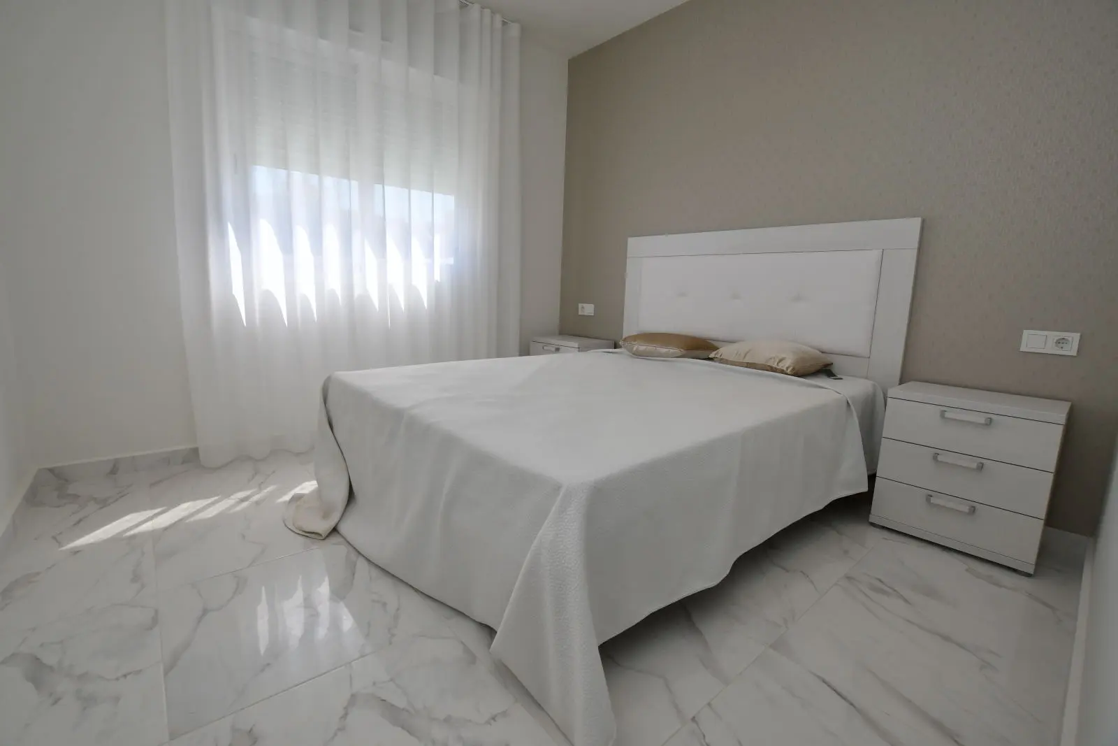 Les appartements sont spacieux et aménagés de façon moderne. Vous avez le choix entre un appartement au rez-de-chaussée avec 2 chambres, 2 salles de bains, deux grands jardins privés et une place de parking privée, ou un penthouse avec 2 chambres, 2 salles de bains et une vaste terrasse privée sur le toit avec vue sur la mer. Il est également possible d’opter pour une configuration à 3 chambres (en option). Toutes les habitations de 3 chambres sont livrées avec des équipements de cuisine inclus.