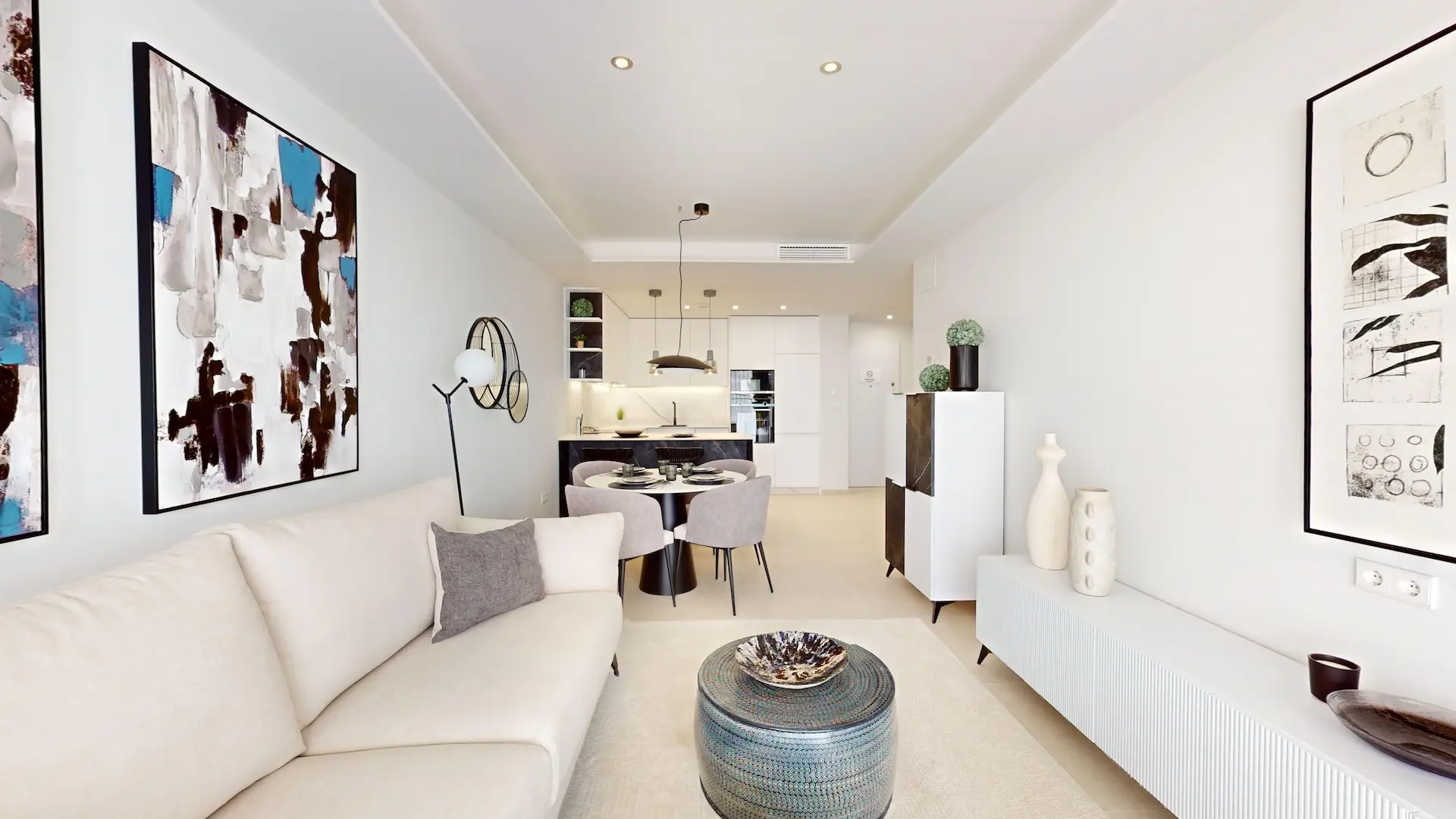 Het project omvat stijlvolle appartementen met 2 of 3 slaapkamers, ruime terrassen en verschillende indelingen. Er zijn beganegrondmodellen met tuin, tussenverdiepingen met groot terras, en penthouses met een privé dakterras en pergola. De lichte woonruimte met open keuken, eetkamer en woonkamer vormt een elegant geheel dat direct aansluit op het terras. De hoofdslaapkamer beschikt over een en-suite badkamer en in sommige modellen uitzicht op zee.