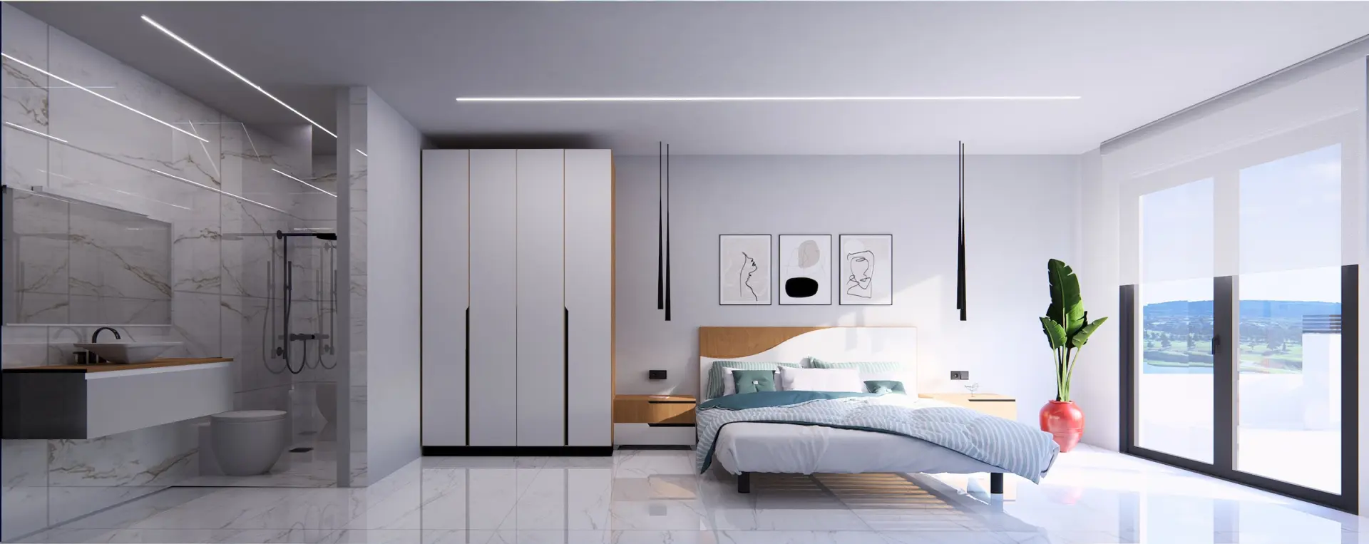 De moderne appartementen zijn beschikbaar in verschillende modellen: een gelijkvloerse woning met 2 of 3 slaapkamers en een ruime tuin, of een penthouse met 2 slaapkamers en een privé dakterras. Elk appartement heeft een open leefruimte met een moderne keuken, eetgedeelte en lounge, grote ramen en toegang tot een overdekt terras. De penthouses bieden een interne trap naar het ruime solarium, perfect om te ontspannen met uitzicht op de golfbaan.