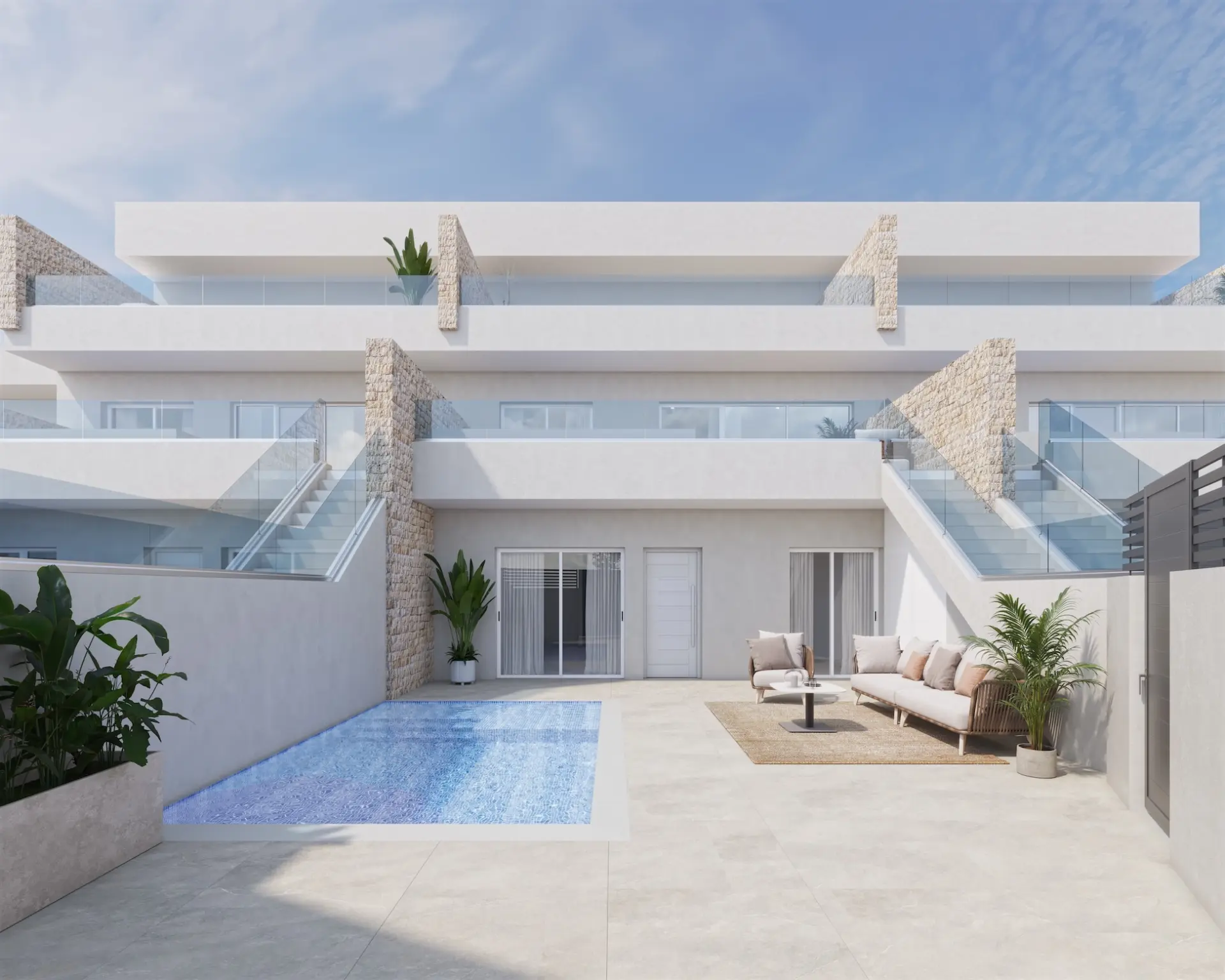 Buitenleven wordt echt gevierd in deze ontwikkeling, met elke woning met een eigen privé zwembad. Het zonnige Costa Blanca klimaat biedt de perfecte achtergrond om te genieten van deze eigen buitenruimte. Of u nu ontspant bij het zwembad of een zomerbijeenkomst organiseert, deze woningen bieden de ideale omgeving voor buitenvermaak. De eigen tuin, die beschikbaar is met de begane grondeenheden, voegt een extra laag charme en ruimte toe om te genieten van de prachtige omgeving.