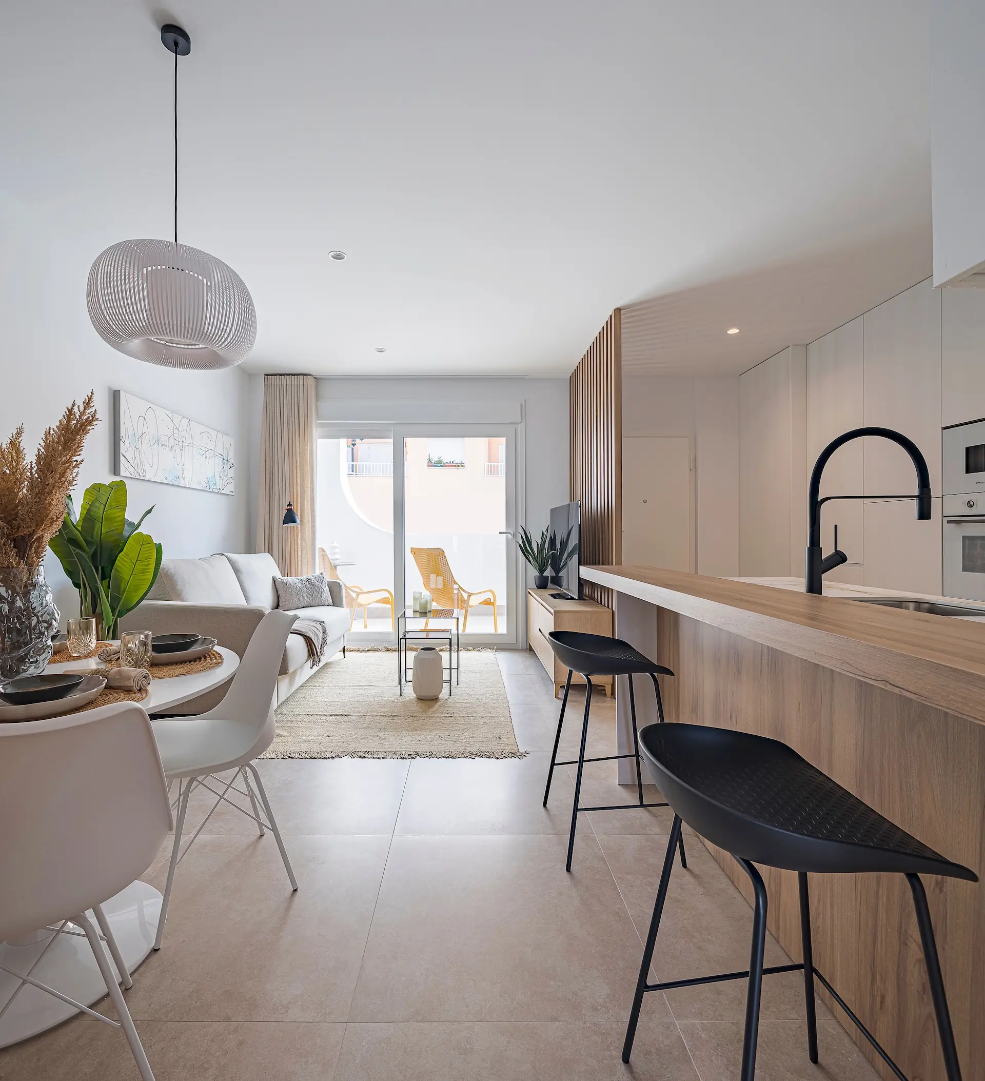 Elk appartement beschikt over 2 slaapkamers en 2 badkamers, met een lichte open woonruimte waarin de woonkamer, eetkamer en keuken samenkomen. De hoofdslaapkamer heeft een eigen en-suite badkamer voor extra privacy. Deze woningen zijn volledig uitgerust met keukenapparatuur, binnen- en buitenverlichting met LED, vooraf geïnstalleerde airconditioning via kanalen en een privéparkeerplaats binnen de gemeenschap.