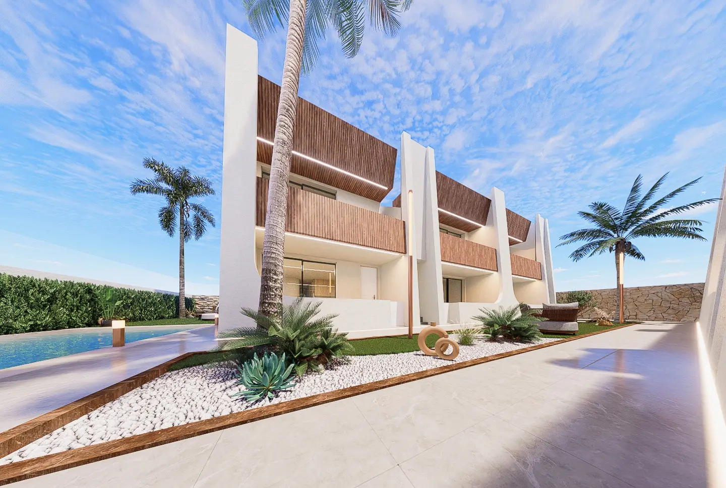 Bewoners genieten van toegang tot een prachtig gemeenschappelijk zwembad, aangelegde tuinen en privéparkeerplaatsen binnen de gemeenschap. Het algehele ontwerp bevordert een ontspannen en zorgeloze levensstijl, met weinig onderhoud en veel comfort. Deze woningen zijn ideaal voor permanent verblijf of als vakantieverblijf aan zee.