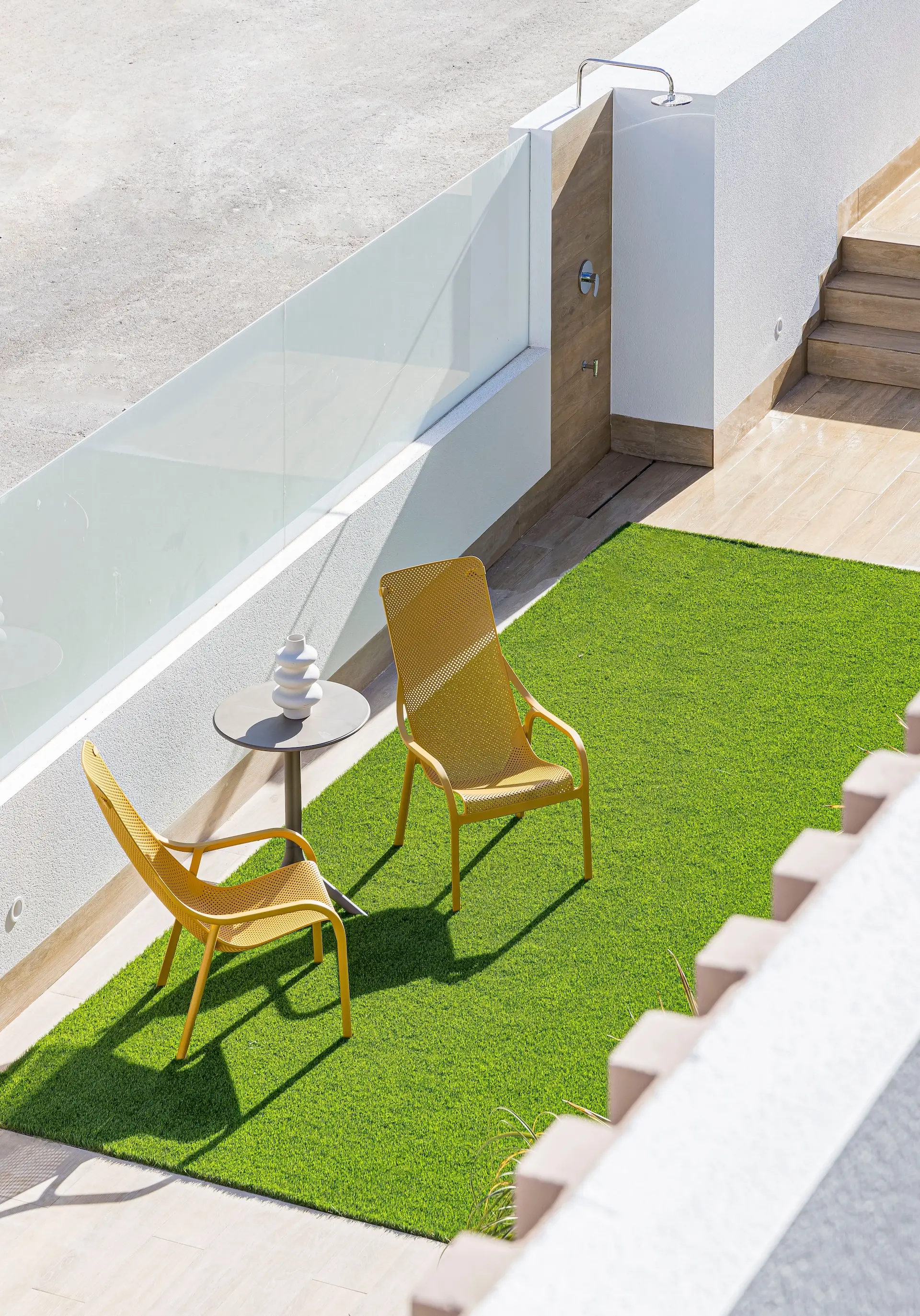 U kunt kiezen tussen appartementen op de begane grond met een overdekt terras of bovenwoningen met een privé-solarium. De buitenruimtes zijn ideaal om te genieten van het zonnige weer, of u nu ontspant met een boek, buiten dineert of gasten ontvangt. De solariums op de bovenste verdieping bieden extra privacy en een weids uitzicht over de omgeving.