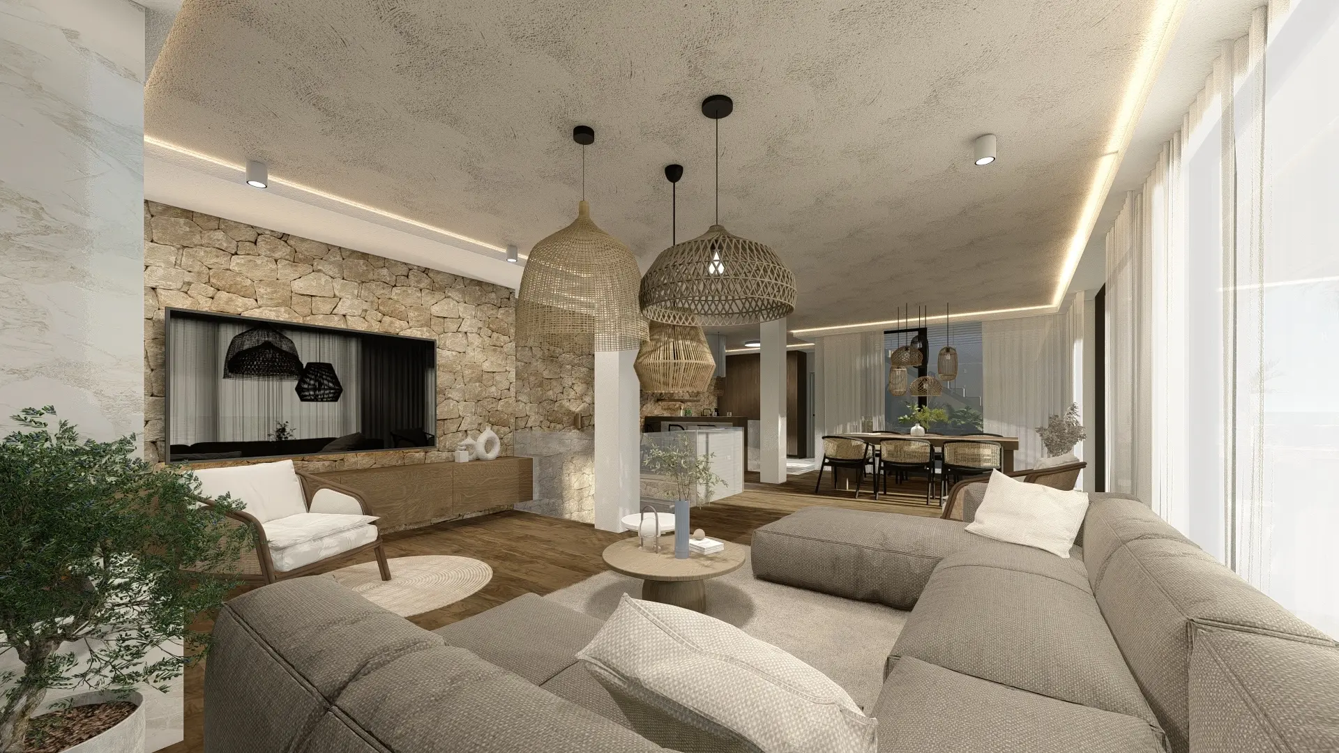 Elke villa is volledig gerenoveerd volgens de hoogste hedendaagse normen, met aandacht voor elk detail. Binnen treft u een lichte, open indeling met 4 ruime slaapkamers en 2 moderne badkamers. De hoofdwoonruimte beschikt over kamerhoge ramen die het adembenemende landschap omlijsten en naadloos aansluiten op een strakke, geïntegreerde keuken—ideaal voor gezinsleven en het ontvangen van gasten. Hoogwaardige afwerkingen, natuursteen en zachte tinten creëren overal een ontspannen, elegante sfeer.