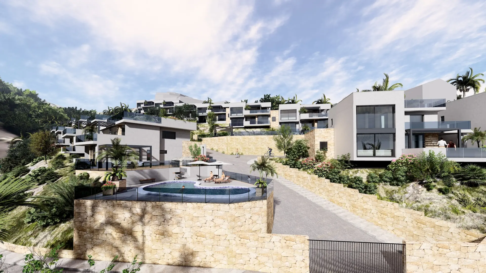 Stap naar buiten en geniet van uw eigen privé-oase. Elke villa staat op een royaal perceel variërend van 295 tot 630 m² en beschikt over een privézwembad op het dak, een zonneterras met pergola en een garage voor twee auto’s. De buitenruimtes zijn ontworpen om te ontspannen in de zon of samen te komen met vrienden, terwijl u geniet van het indrukwekkende uitzicht op zee en bergen.
