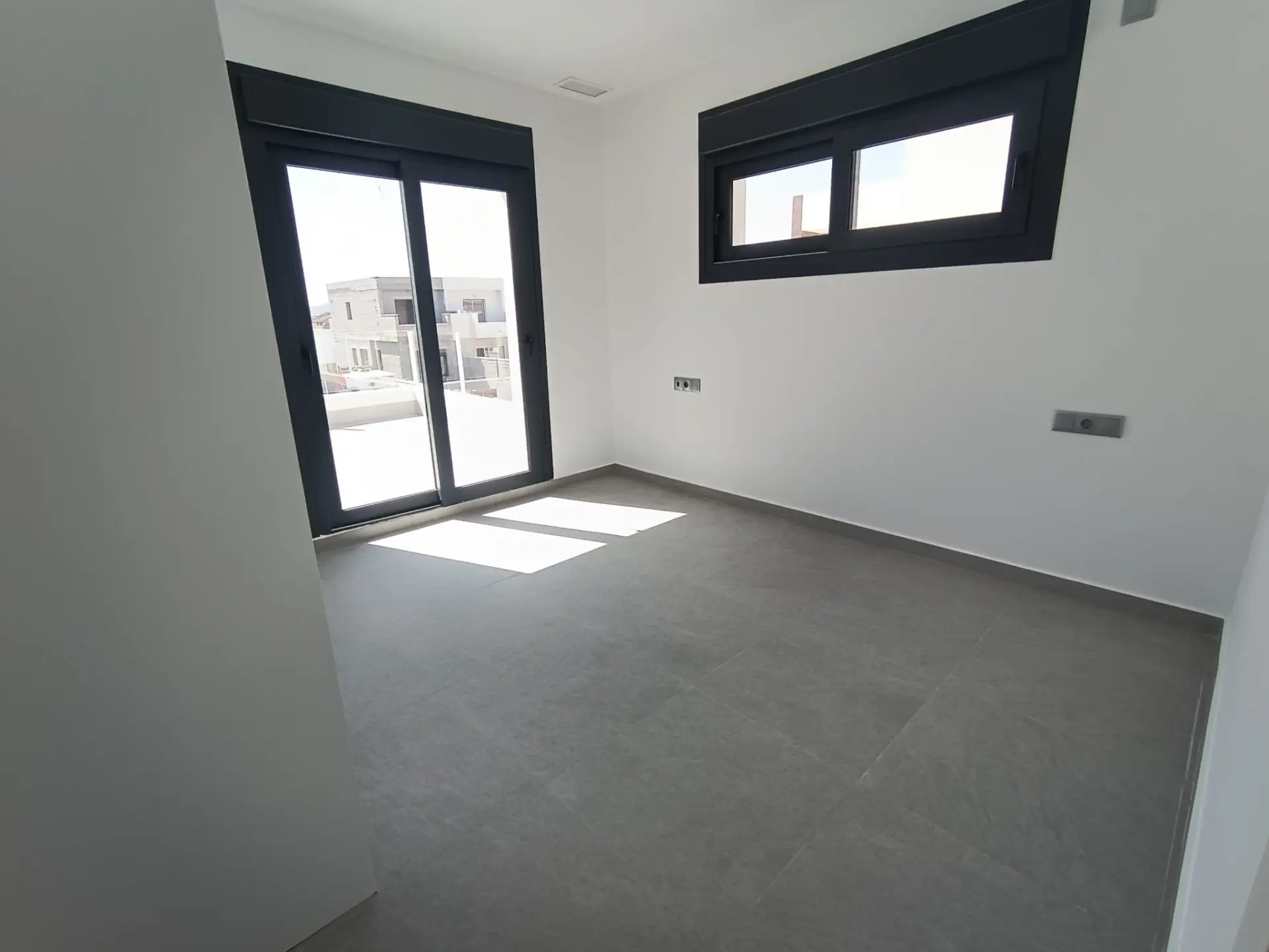 Inside, the villas feature a spacious open-plan living and dining area, a modern kitchen, and three double bedrooms with fitted wardrobes. The ground floor includes one en-suite bedroom that opens to the terrace and pool. Two additional bedrooms, a guest bathroom, and a private solarium are found upstairs. Pre-installed air conditioning and premium finishes ensure comfort and quality throughout.