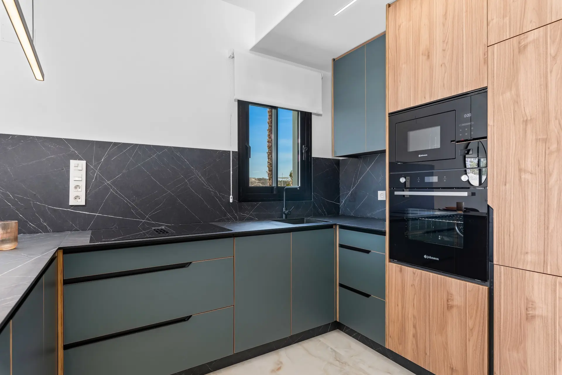 These elegant homes feature unique marble-effect façades and wood-panelled interiors, adding a touch of sophistication. Other features include pre-installed ducted air conditioning, white goods, underfloor heating in the bathrooms, electric shutters, and stylish lighting in key areas. The villas also come with a private pool, an artificial grass garden with native plants and a palm tree, and a pergola-covered parking space.