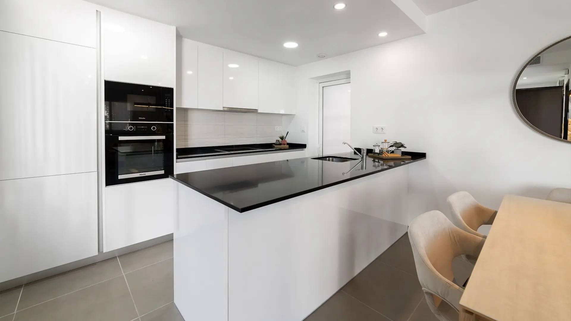 Each villa is thoughtfully designed with 3 bedrooms and 2 bathrooms, spread across three levels — ground floor, first floor, and a spacious basement. The bright living areas connect seamlessly with private gardens, and the open kitchen and dining areas are perfect for entertaining. High-quality finishes include underfloor heating in the bathrooms, electronic entry systems, and energy-efficient aerothermal technology. Villas with solariums also offer stunning views of the sea in the distance.