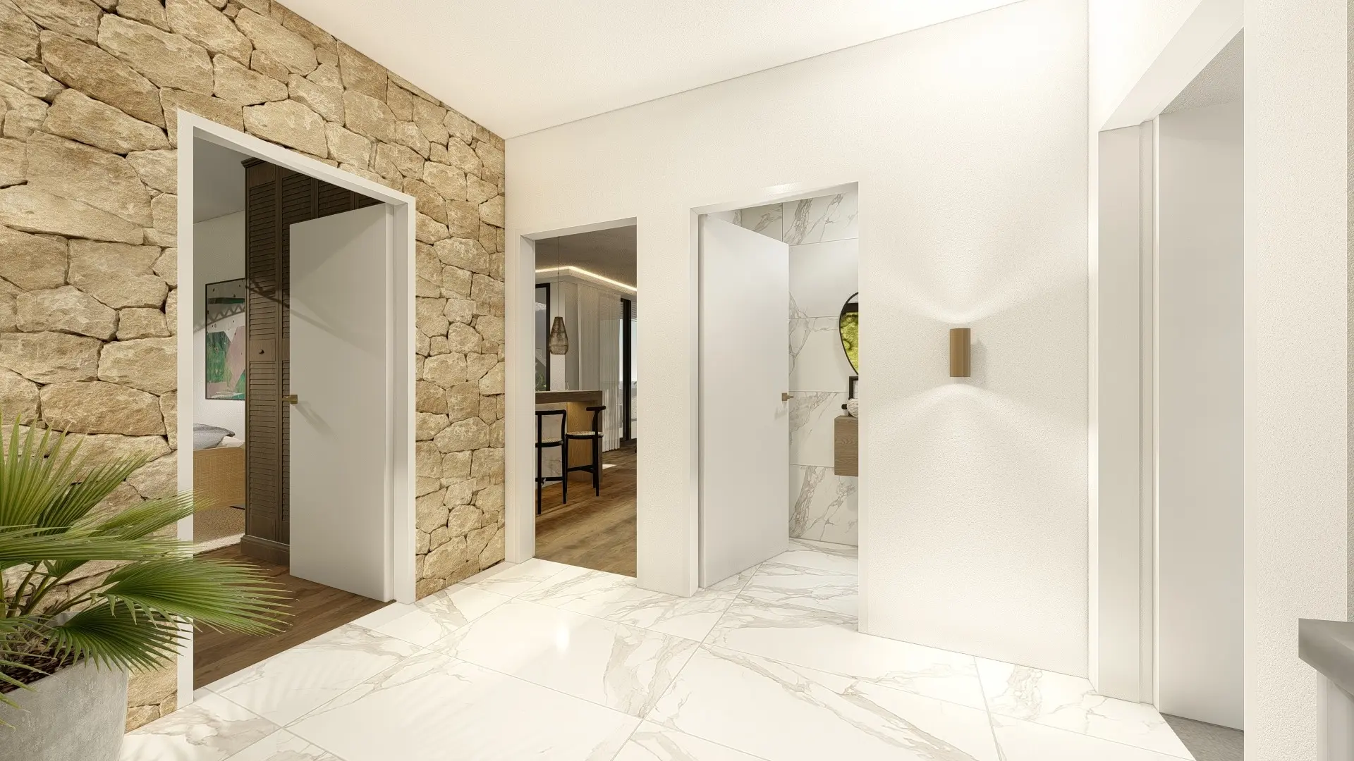 Each villa has been completely renovated to meet today’s high standards, with attention to every detail. Inside, you’ll find a bright open-plan layout with 4 spacious bedrooms and 2 modern bathrooms. The main living area features floor-to-ceiling windows that frame the stunning landscape and connect seamlessly to a sleek, integrated kitchen—ideal for family life and entertaining. Premium finishes, natural stone, and soft tones create a relaxed, elegant atmosphere throughout.