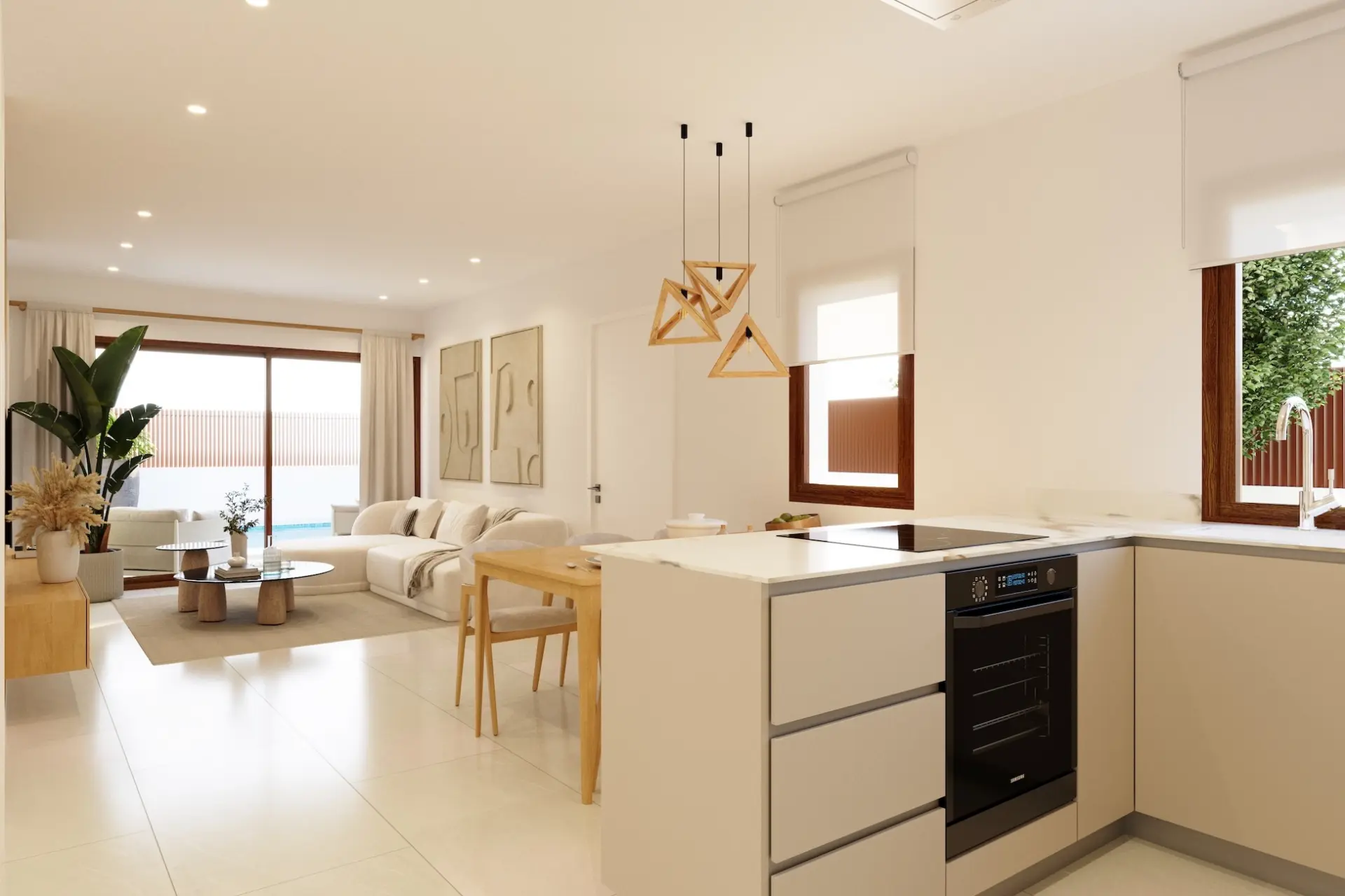 The homes in this exclusive development are crafted with meticulous attention to detail and offer a variety of layouts to suit your needs. The semi-detached villas are ideal for those seeking a compact yet luxurious home, with 2 bedrooms and 2 bathrooms on a single level. The townhouses, with 3 bedrooms and 3 bathrooms, provide spacious living areas across multiple levels, complete with private solariums. For those desiring more space, the detached villas boast 4 bedrooms, 3 bathrooms, and a guest toilet, situated on generous plots of over 300m², each featuring a private garden and pool. Every property is equipped with energy-efficient features, including photovoltaic solar panels, automated blinds, and underfloor heating in bathrooms, ensuring comfort and sustainability.