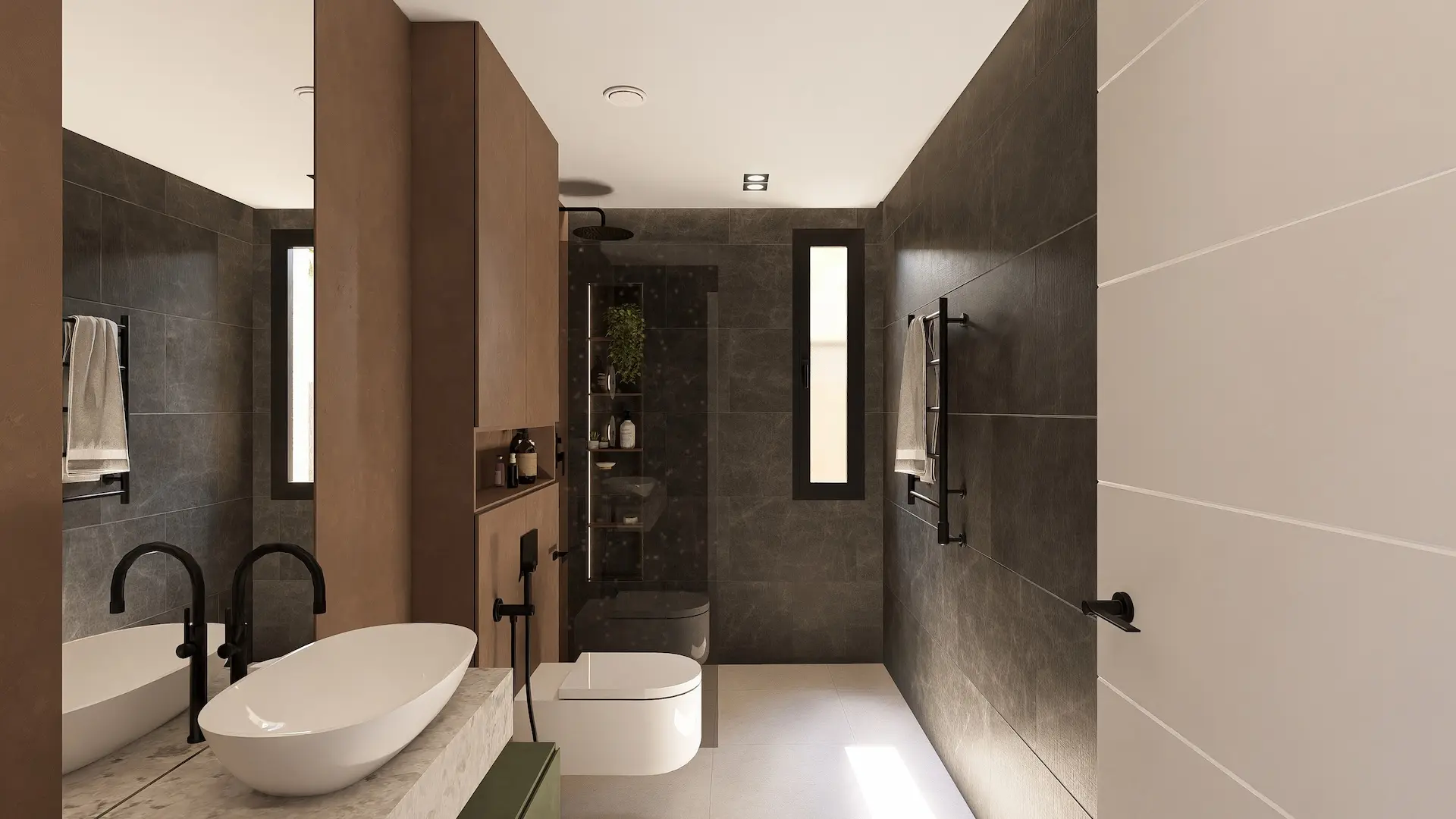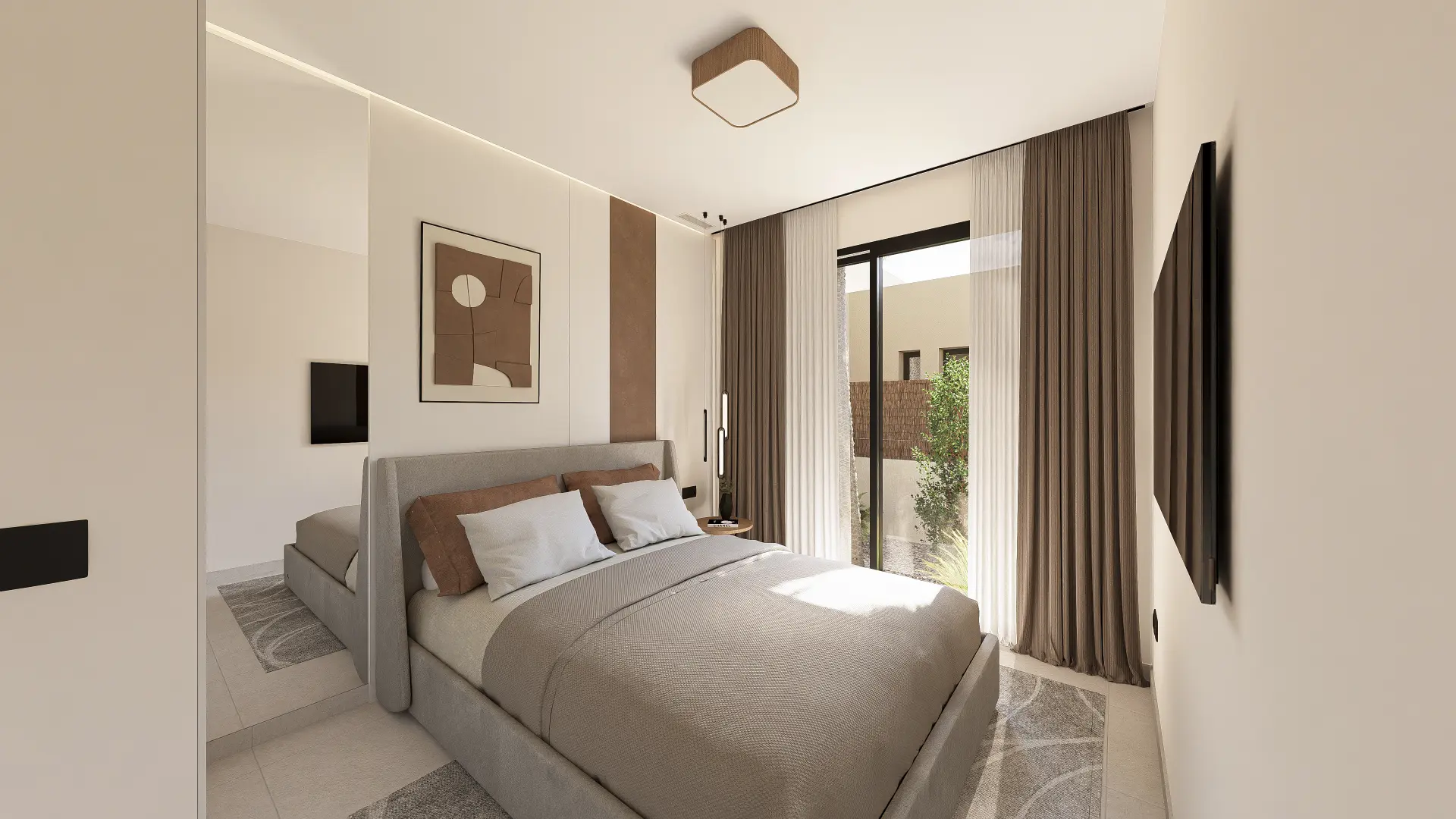With a built area of 142m², the property features three bedrooms and three luxurious bathrooms. The open-plan living room with integrated kitchen forms the heart of the home, where light and space take center stage. High-quality finishes such as double glazing, built-in wardrobes, and underfloor heating in the bathrooms ensure ultimate comfort. Smart technology, electric shutters, and a video intercom enhance both convenience and security.