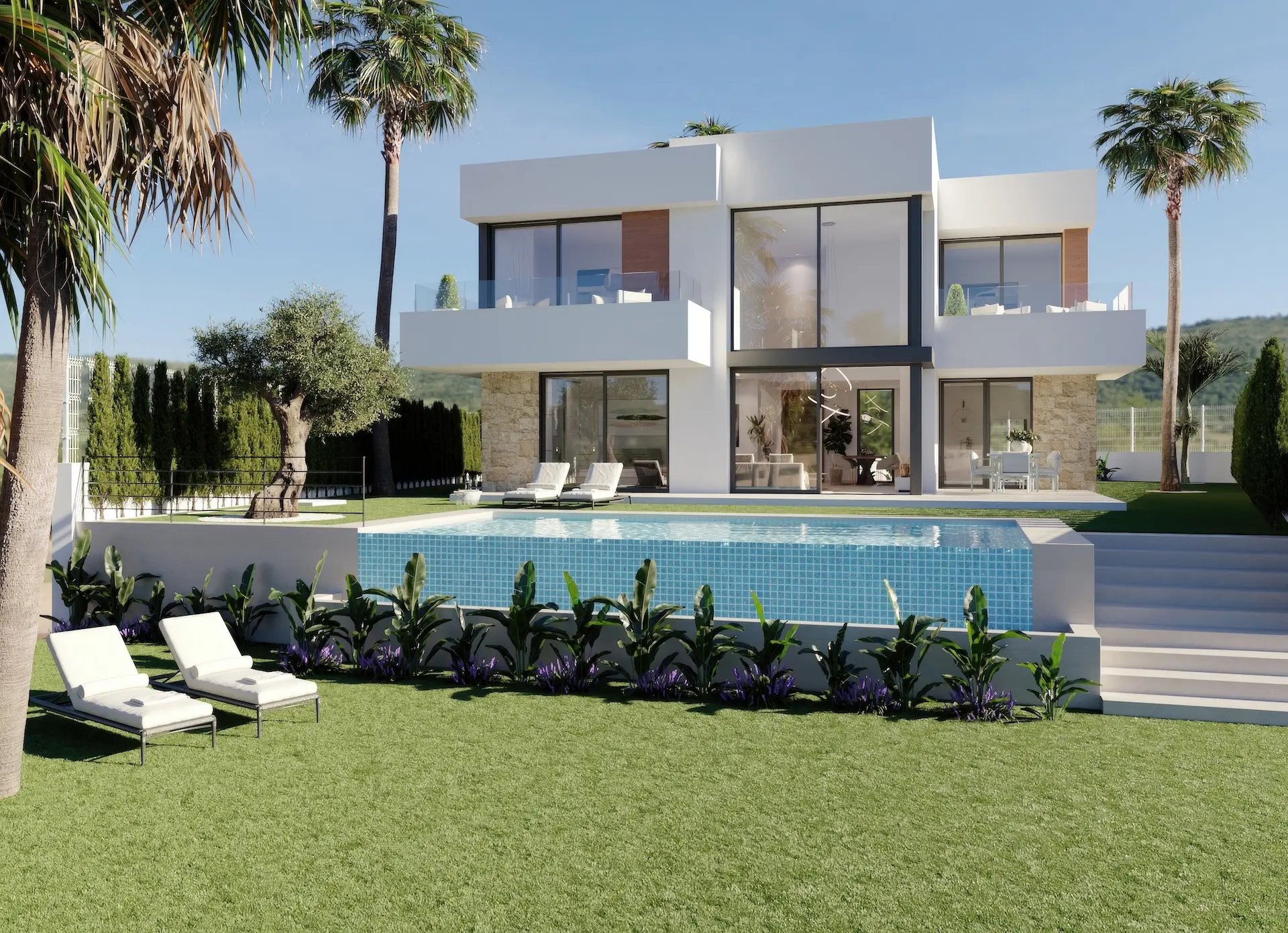 The villa is spread over two floors and features 3 or 4 spacious bedrooms and 3 stylish bathrooms. The bright living room, dining area, and fully equipped kitchen form one open space, with large windows opening onto the partially covered terrace and beautifully landscaped garden. Here, you can fully enjoy the Mediterranean climate and the magnificent views.
