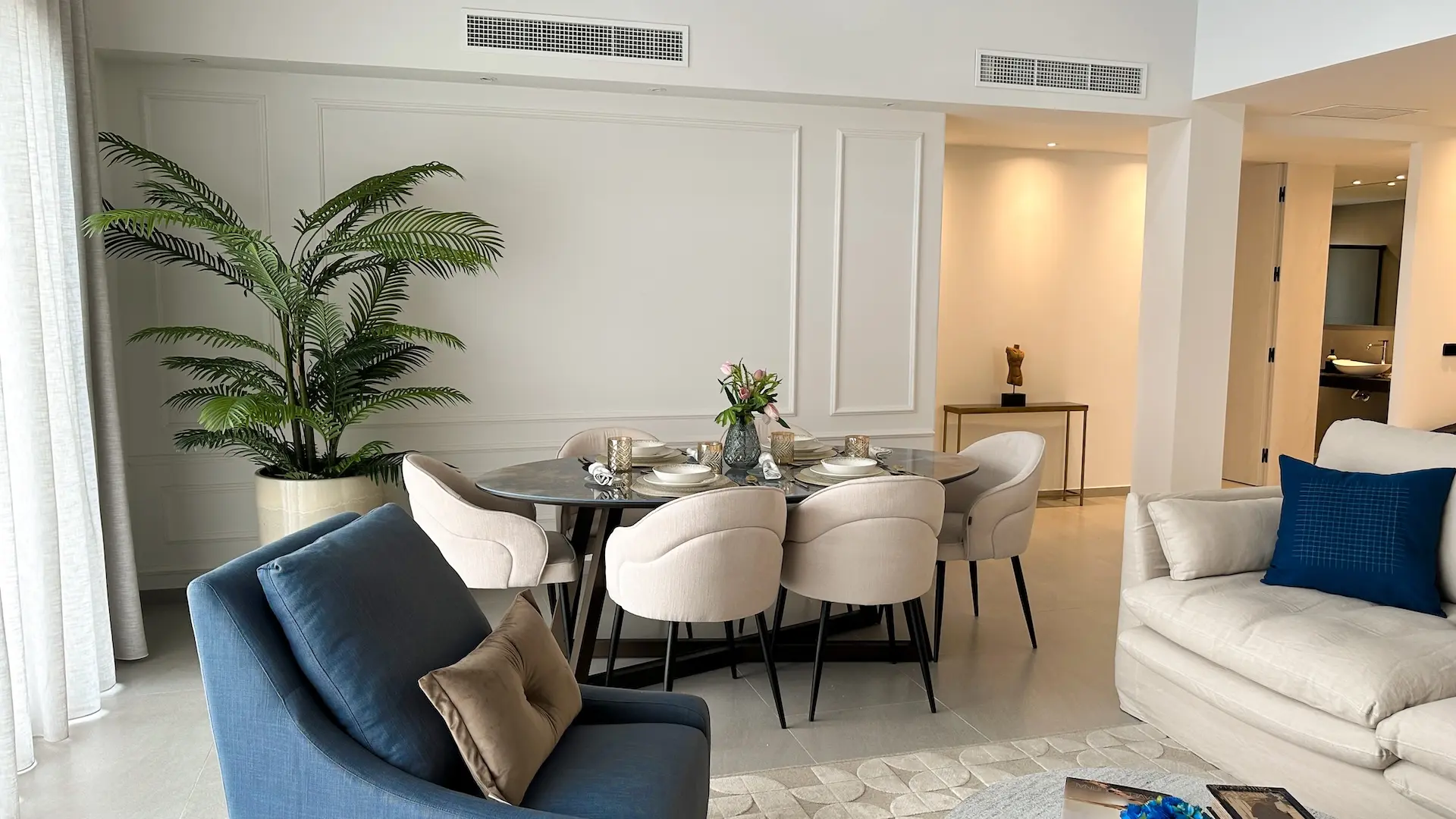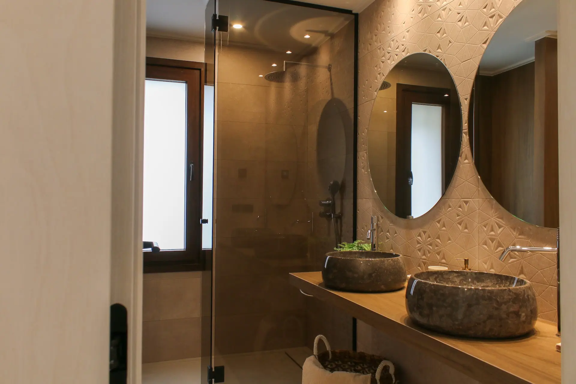 The villas are designed in an elegant Mediterranean style and are all situated on one level. They feature 3 bedrooms and 2 bathrooms, with bright and open living spaces. The high ceilings in the living room create a sense of space and comfort, while the finishes are executed with high-quality materials.