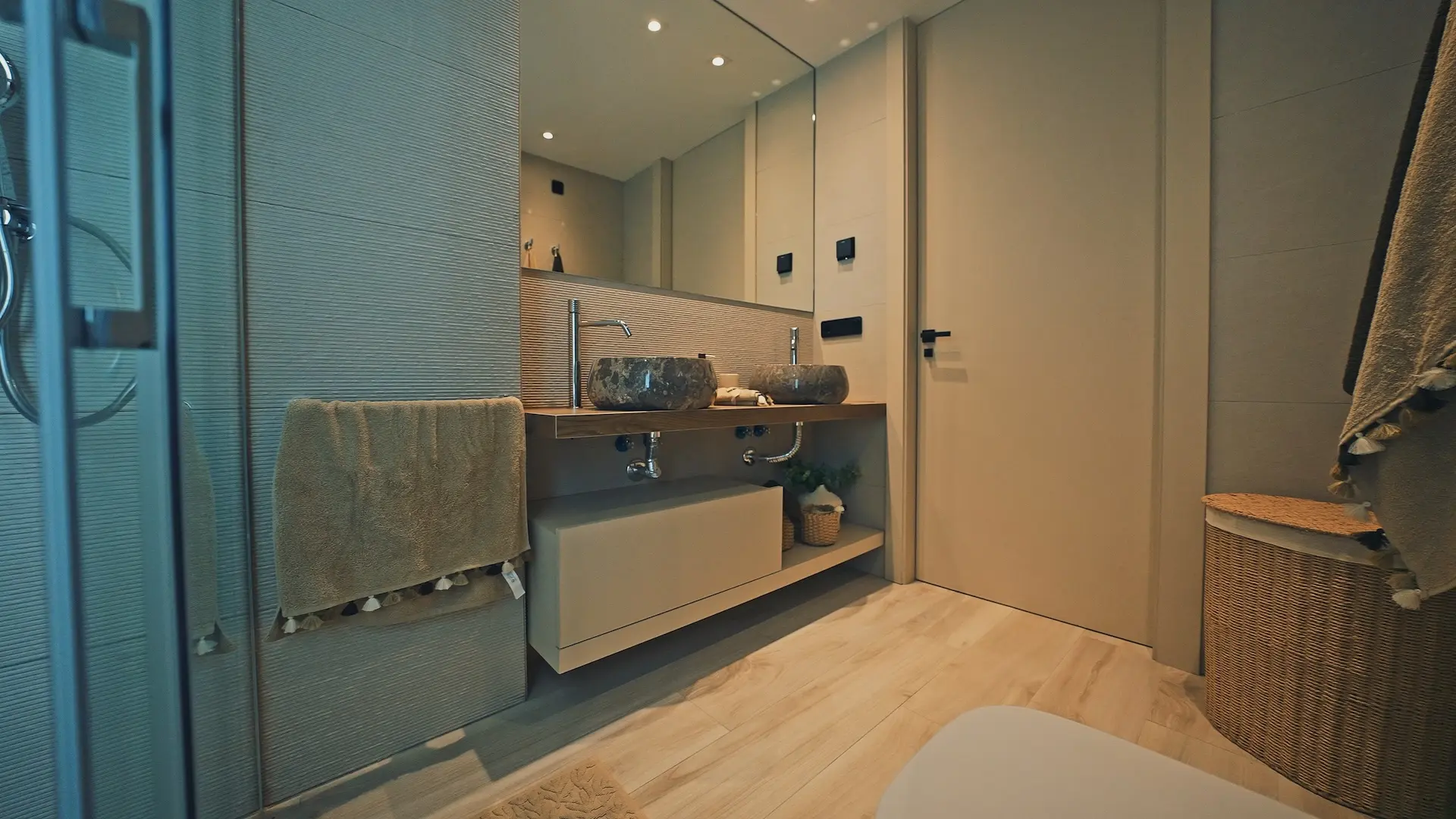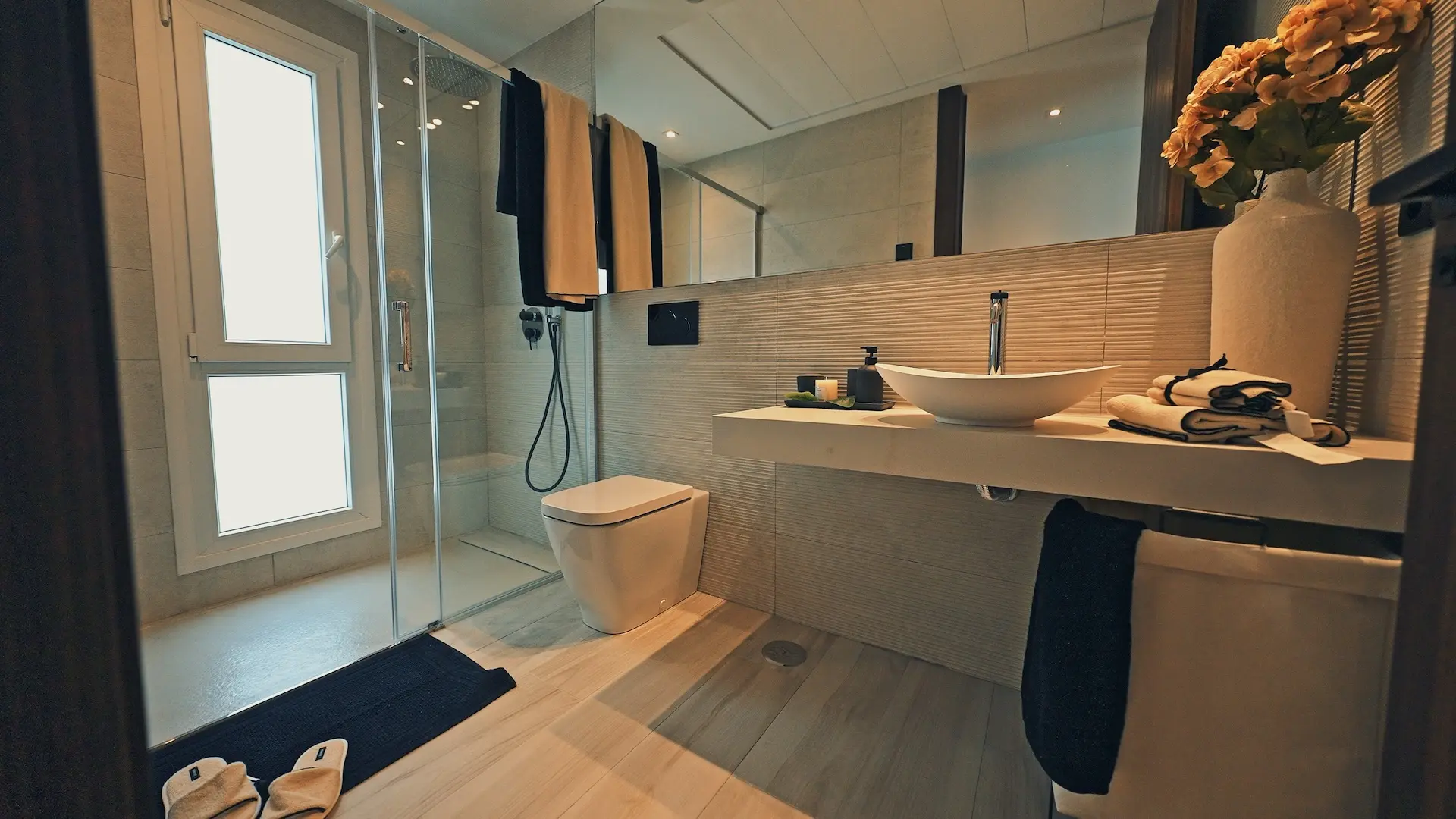 With air conditioning, underfloor heating in the bathrooms, a private pool with outdoor shower, and parking, this villa is fully equipped for maximum comfort.