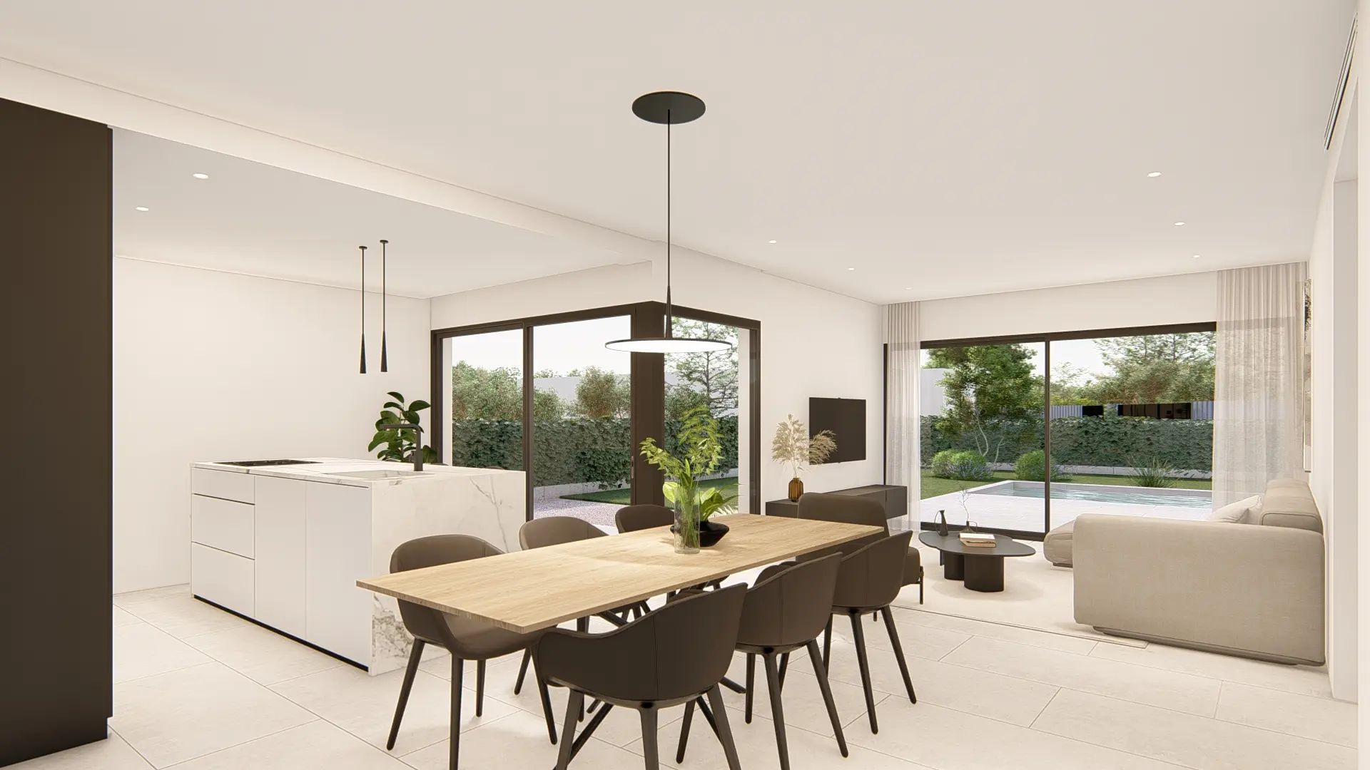 This villa is designed on one level and features 3 bedrooms and 2 bathrooms. The open living area with lounge and kitchen forms the heart of the home and is bright, spacious, and practically arranged. Large windows provide a pleasant connection between indoors and outdoors. All bedrooms are comfortably sized and equipped with built-in wardrobes, while the bathrooms are finished with modern materials and stylish details.