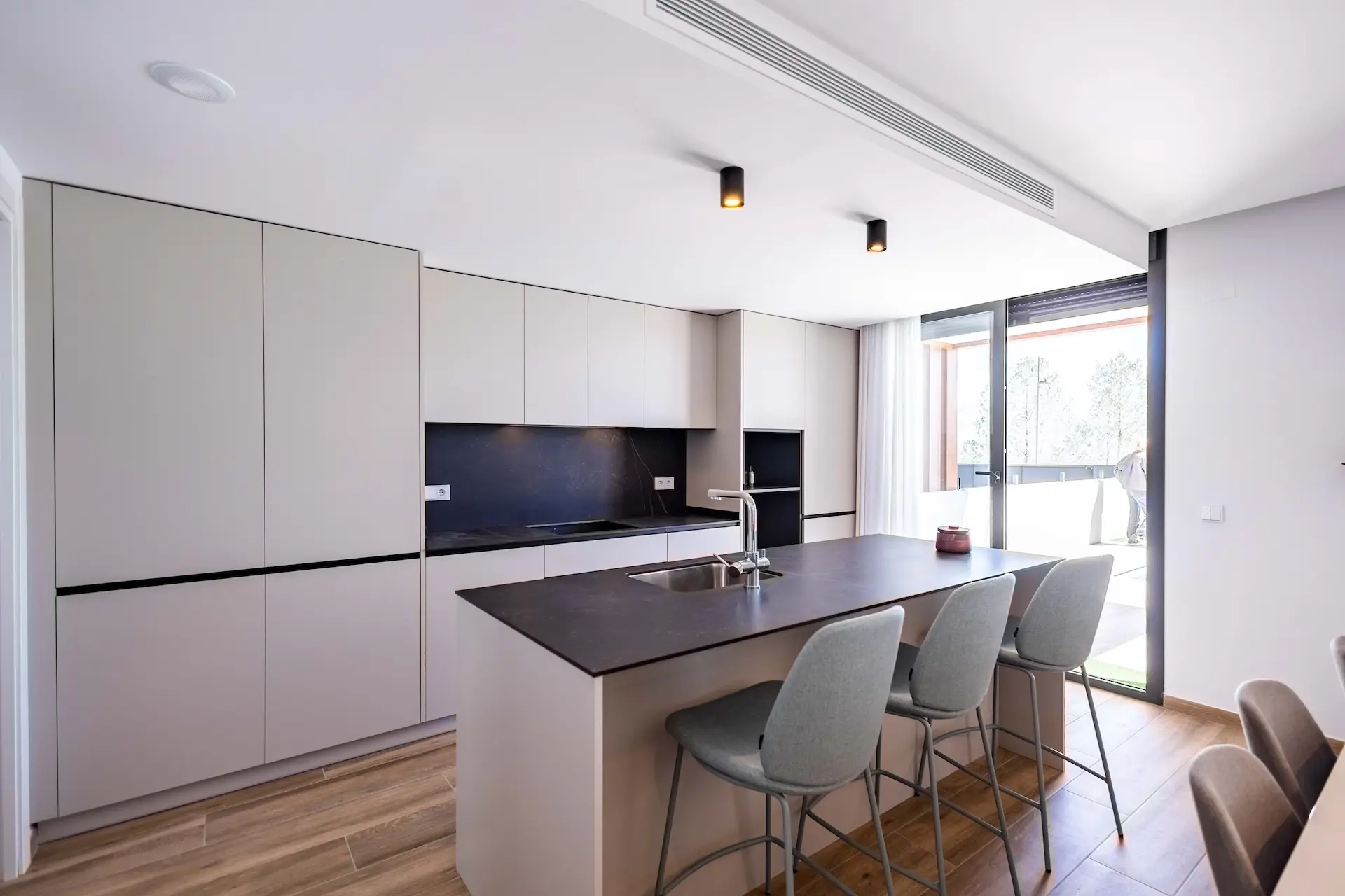 The interior of the villa is carefully designed with attention to space and light. The open layout connects the fully equipped kitchen with the spacious living room, creating an ideal place for both family life and entertaining guests. The four bedrooms feature built-in wardrobes and large windows, giving each room a sense of tranquility and privacy. Luxurious bathrooms, high-quality materials, double glazing, and a reinforced door contribute to a feeling of safety and comfort. Modern technologies such as aerothermal systems ensure energy-efficient living.