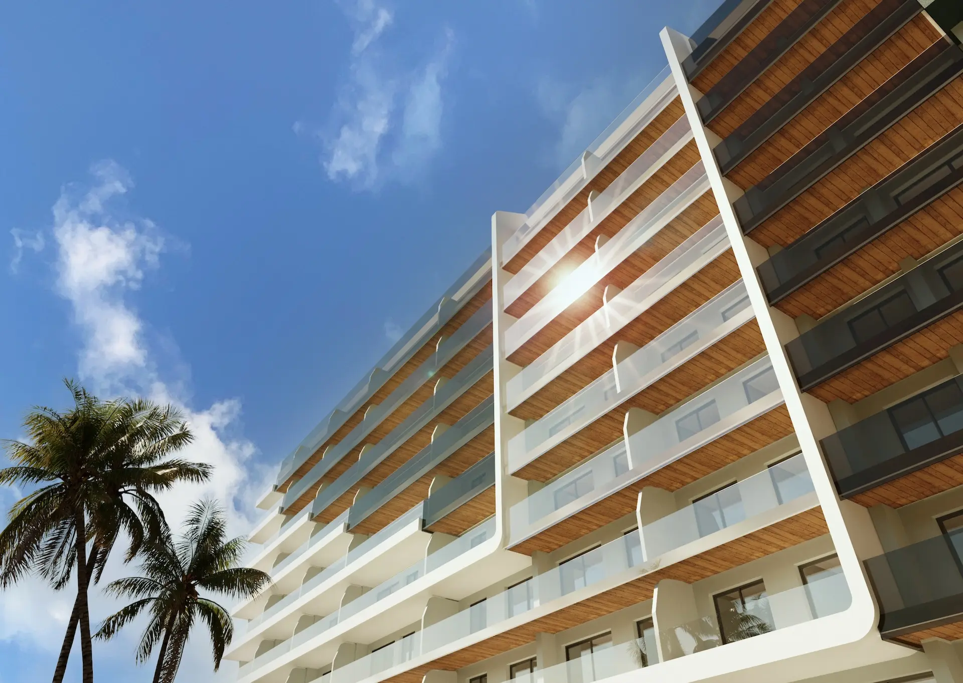 The project offers apartments with 2 or 3 bedrooms and 2 bathrooms, available on the ground floor with a private garden, middle floors with spacious terraces, and penthouses with a private solarium. All properties are south-facing and feature a bright living room with an open kitchen and breakfast bar. Large sliding doors provide access to the terrace overlooking the beautiful gardens and communal amenities.