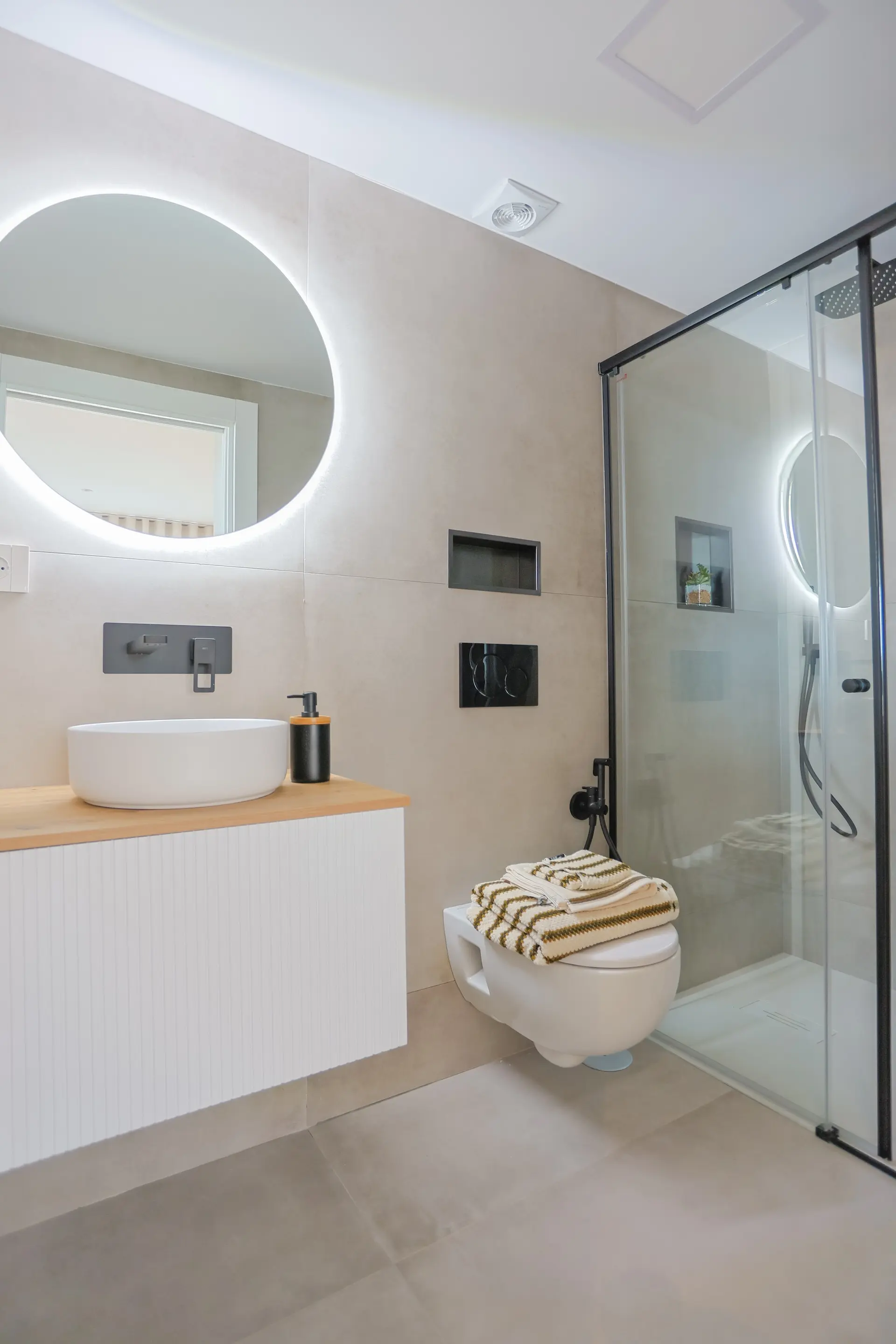 The residence consists of elegant apartments with 2 or 3 bedrooms and 2 bathrooms. The bright living spaces are designed with open kitchens, fully equipped with Bosch or Siemens appliances, and underfloor heating in the bathrooms for extra comfort. Each apartment features built-in wardrobes, air conditioning, electric shutters, a private storage room, and a parking space with a charging point for electric cars.