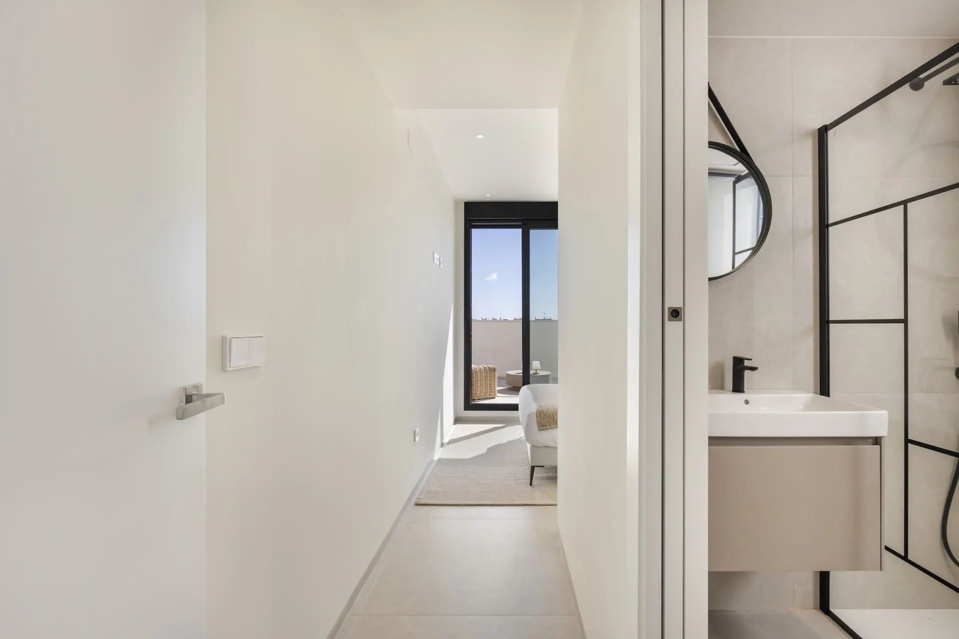 Each villa is spread over two floors and features 3 bedrooms and 3 bathrooms, two of which are en suite. The open-plan living room with dining area and kitchen forms the heart of the home, with large sliding doors that let in plenty of light and provide direct access to the terrace. The kitchen is equipped with integrated appliances and modern finishes. On the ground floor, there is a bedroom and bathroom, while the upper floor offers two additional bedrooms, each with its own bathroom and access to a sunny terrace overlooking the pool.